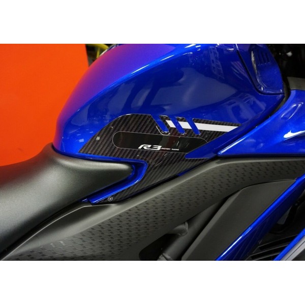 Zwei Harz Tankaufkleber für Motorräder Yamaha R3 2019-2023. 3D-Aufkleber mit Simil-Carbon-Grafik und grauem und schwarzem Finish, maßgeschneidert für R3-Modell von 2019.