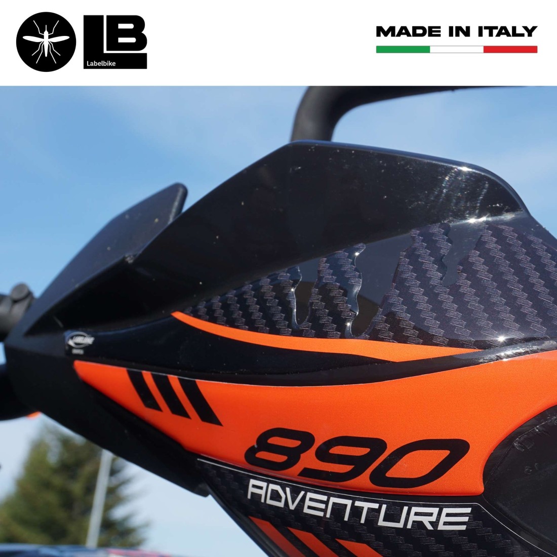 Aufkleber Made in Italy, exklusiv für Labelbike, aus Kunstharz mit Carbon-Look (Carbon-Effekt), orange und "890 Adventure"-Schriftzug. Unsere Aufkleber schmücken und machen Ihre KTM 890 Adventure ab 2021 einzigartig, schützen vor Stößen und Kratzern und sind wetter- und UV-beständig.