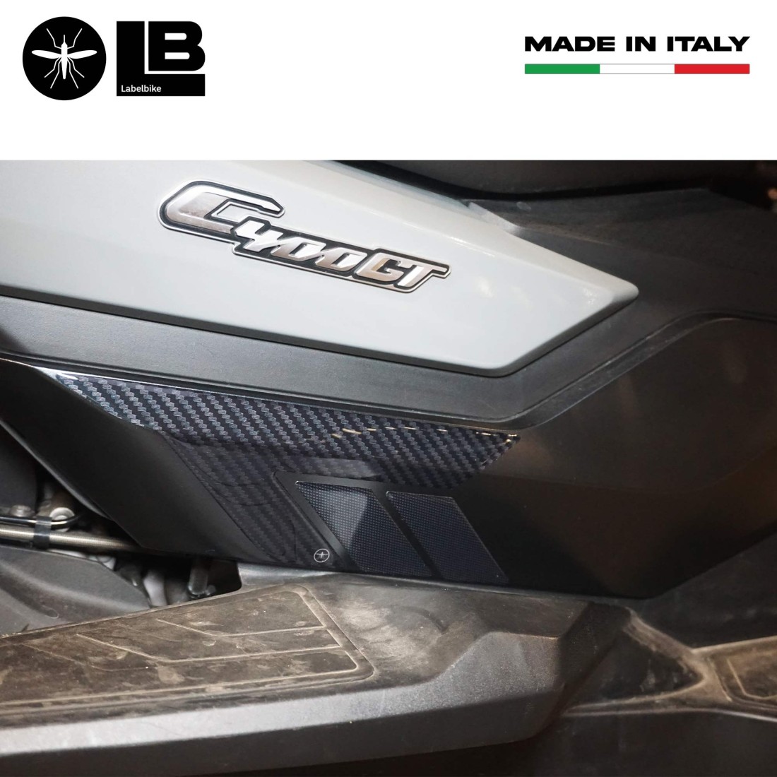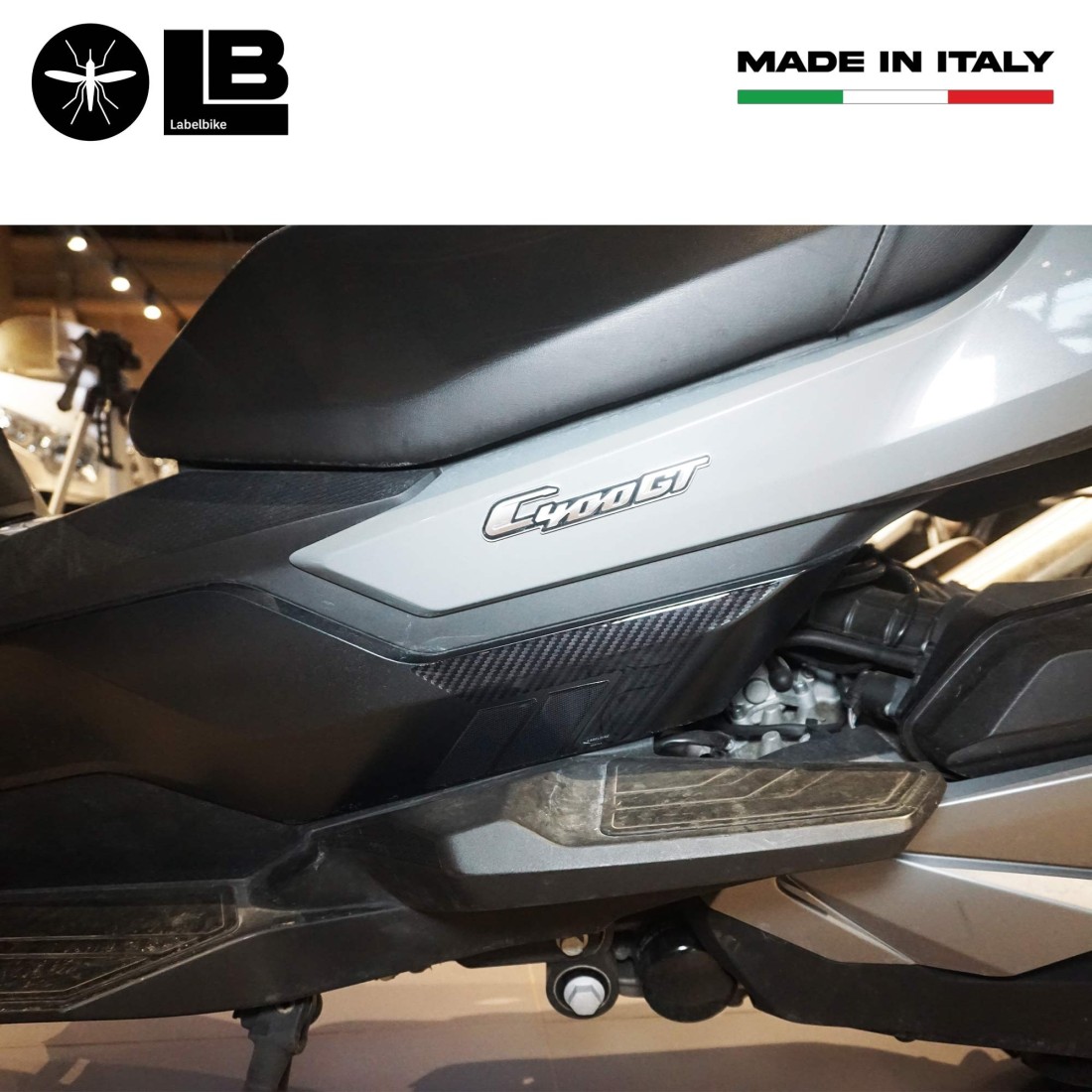 Zwei Schutzaufkleber für Beifahrerfußrasten BMW C400 GT 2021 - 2023. 3D-Aufkleber für die rechte und linke Seite des Maxi Scooters. Carbon-Look und Anti-Rutsch-Grafiken zum Schutz des hinteren Seitenbereichs Ihres C 400 GT.