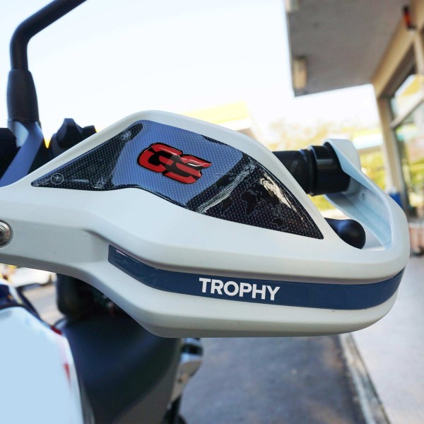 Handschutzaufkleber aus Kunstharz für BMW R 1250 GS Trophy 2022 - 2023 Motorräder. 3D-Gel-Harz-Aufkleber Exklusiv - Labelbike®. Selbstklebende Handprotektoren IN ITALIEN HERGESTELLT Hergestellt aus Harz mit 3D-Effekt. Grafik inspiriert von den Trophy-Farben des Motorrads. Doppelt geprägter 3D-Effekt auf dem GS-Schriftzug.