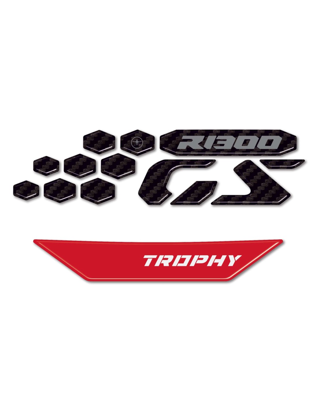 3D-Gel-Harz-Aufkleber, die mit den Farben (Triple Black, Light White und Trophy) der Motorräder kompatibel sindBMW R 1300 GS von 2023 bis 2025. Klebegrafiken für drei verschiedene Farben: