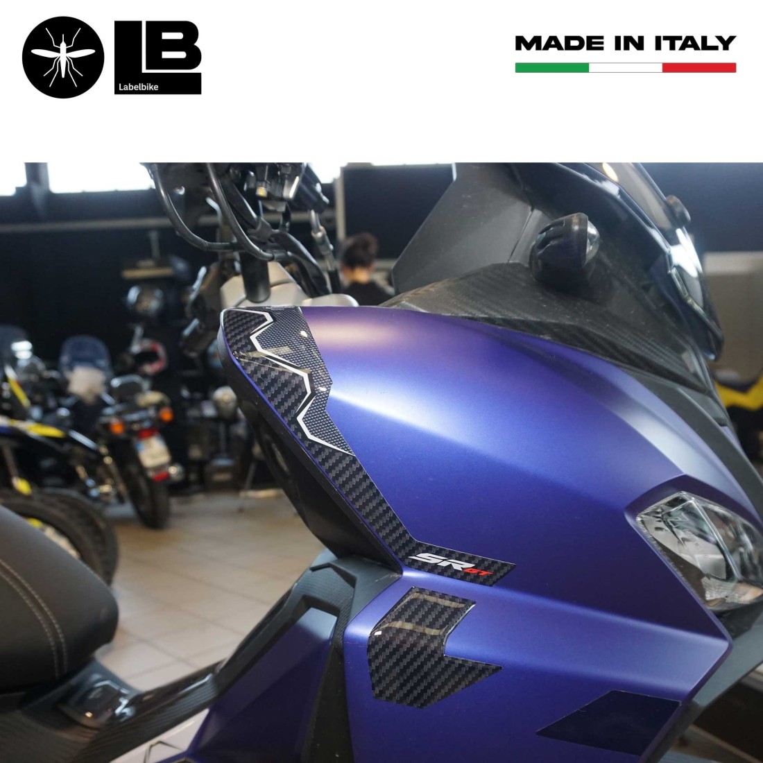Selbstklebende Harzschützer für Aprilia SR GT Roller Seitenverkleidungsbereiche. Grafik mit Basis aus Simil Antislip und Carbon und Schriftzug SR GT. Aufkleber mit 3D-Effekt aus Harz sivi Labelbike® MADE IN ITALY.
