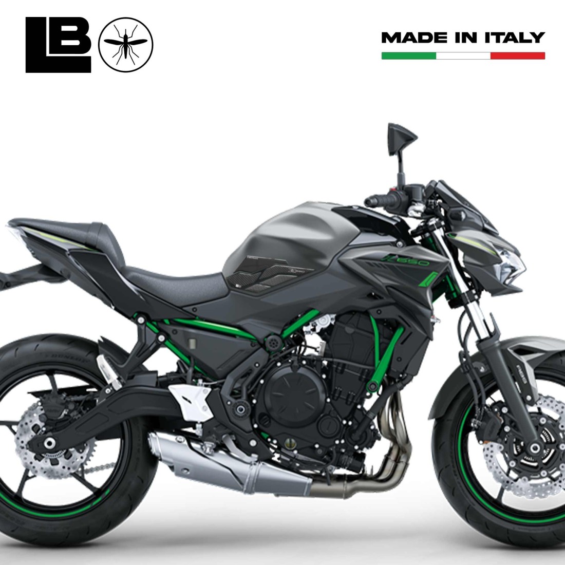 Aufkleber aus Harz für den Seitentankbereich des Motorrads Kawasaki Z650 2023 - 2025. Zwei 3D-Gel-Harz-Aufkleber Exklusiv - Labelbike®. Tank-Seitenaufkleber HERGESTELLT IN ITALIEN aus Harz mit 3D-Effekt. Grafiken mit Carbon Look Basis (Karbon-Effekt) und Schriftzug Z 650 Energize.