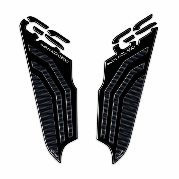- Schwarzer 3D-GEL-HARZ-SEITENSCHUTZ mit "GS"-Schriftzug in Hochrelief und "enduro MOTORRAD"-Schriftzug in Grau.