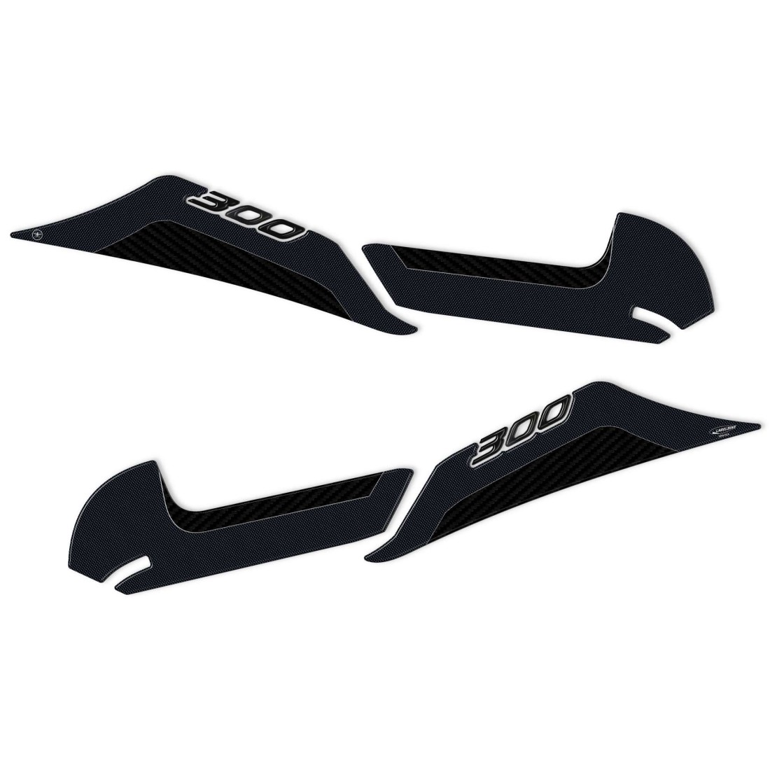 Selbstklebende harzbeschichtete Protektoren für zentralen Trittbrettbereich und den Mitteltunnel. Grafiken mit Basis in Simil Antislip und Carbon und 300 Schriftzug. Aufkleber mit 3D-Effekt aus Harz, Exklusive Labelbike® MADE IN ITALY.