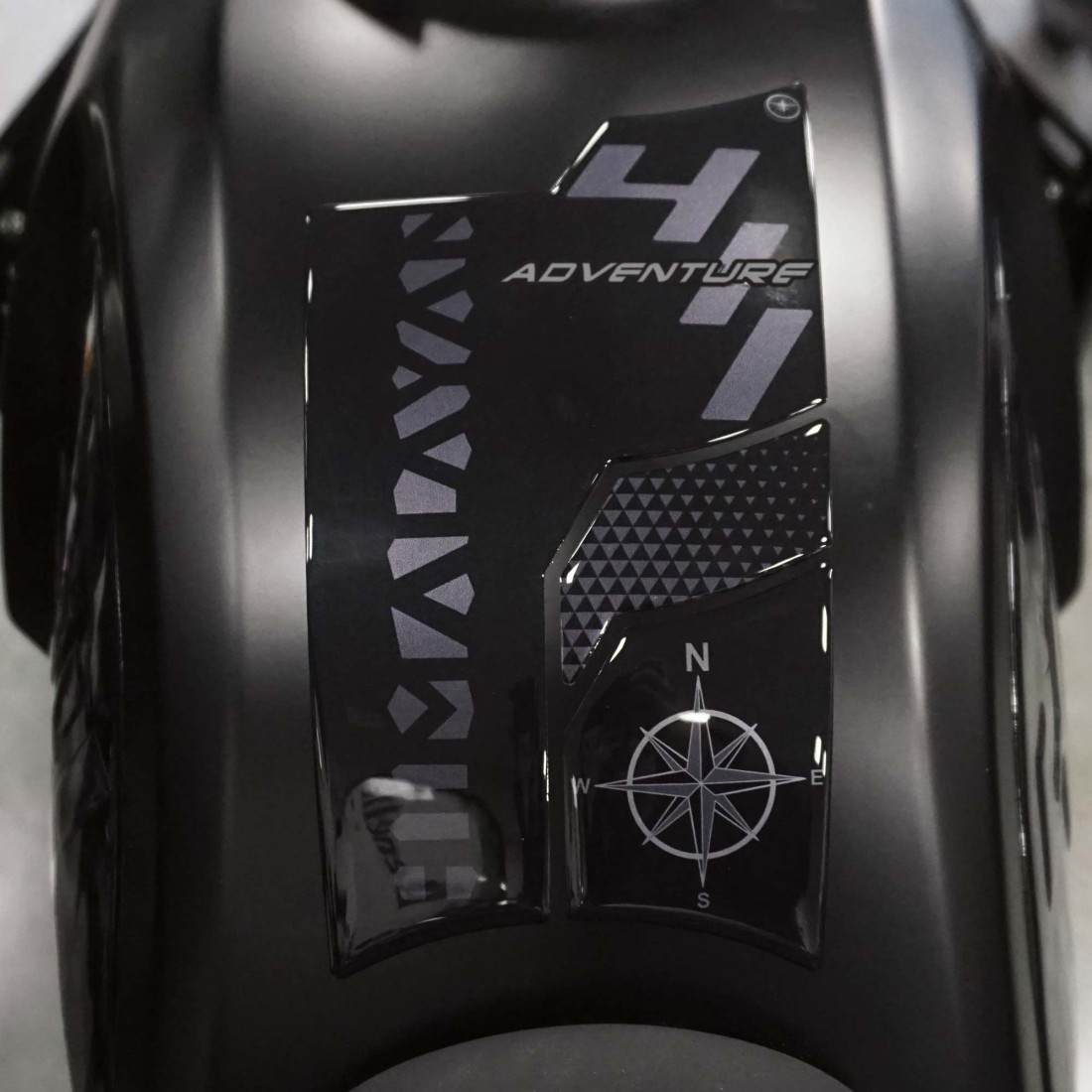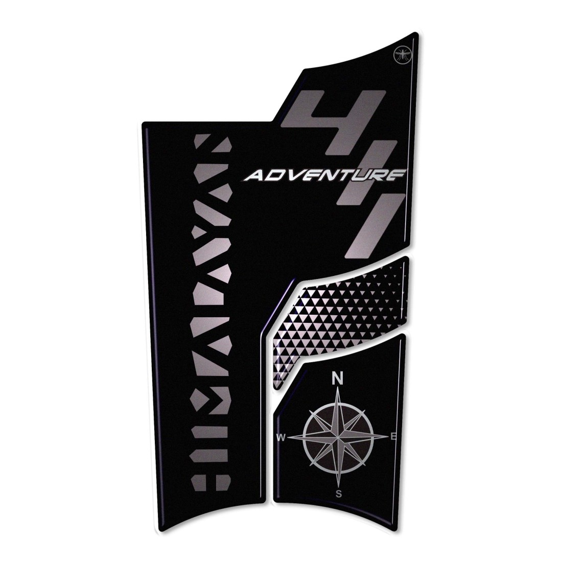 Motorradtankschutz aus 3D-Gelharz auf Metallic-Material. Motorradtankschutz mit schwarzer Grundgrafik und silbernem Metallic-Effekt Adventure-Schriftzug.