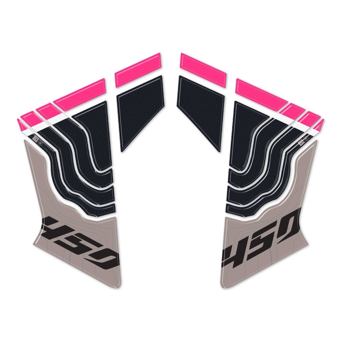 Seitenprotektoren aus Kunstharz für den Motorradtank CFMOTO 450 MT 2024-2025 3D-Aufkleber aus Kunstharz Exklusiv - Labelbike®. Kratzschutzaufkleber für Motorräder HERGESTELLT IN ITALIEN aus Harz mit 3D-Effekt. Gelbe und rosa Grafik mit 450er Schriftzug.
