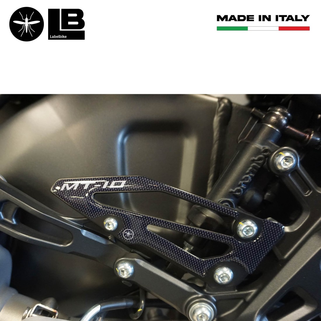 Harz-Fersenschützer-Aufkleber mit 3D-Effekt. Paar für linke und rechte Seite aus selbstklebenden Harzprotektoren mit Grafiken im Carbon-Look (Karbon-Effekt) und MT-10-Schriftzug.