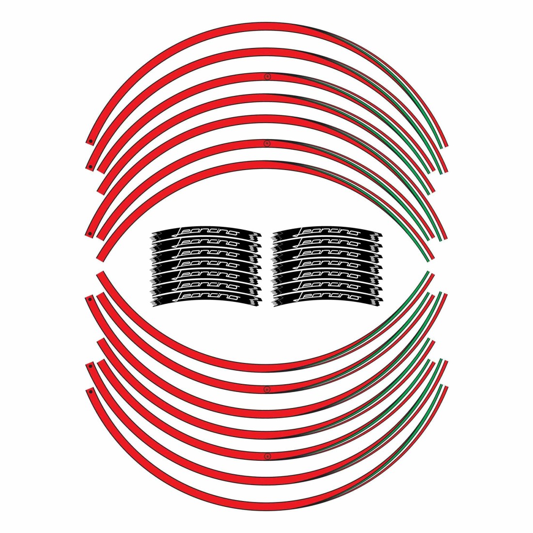 Aufkleber für beide Motorradfelgen, MADE IN ITALY. Basisgrafik in Weiß, Schwarz oder Rot mit Details der italienischen Trikolore und Schriftzug Leoncino. Sie schmücken und verschönern die Ästhetik Ihrer Leoncino Benelli, waschfest, wetterfest und UV-beständig.
