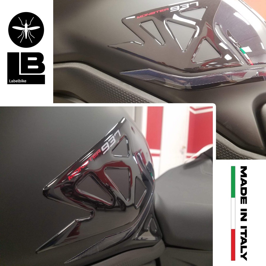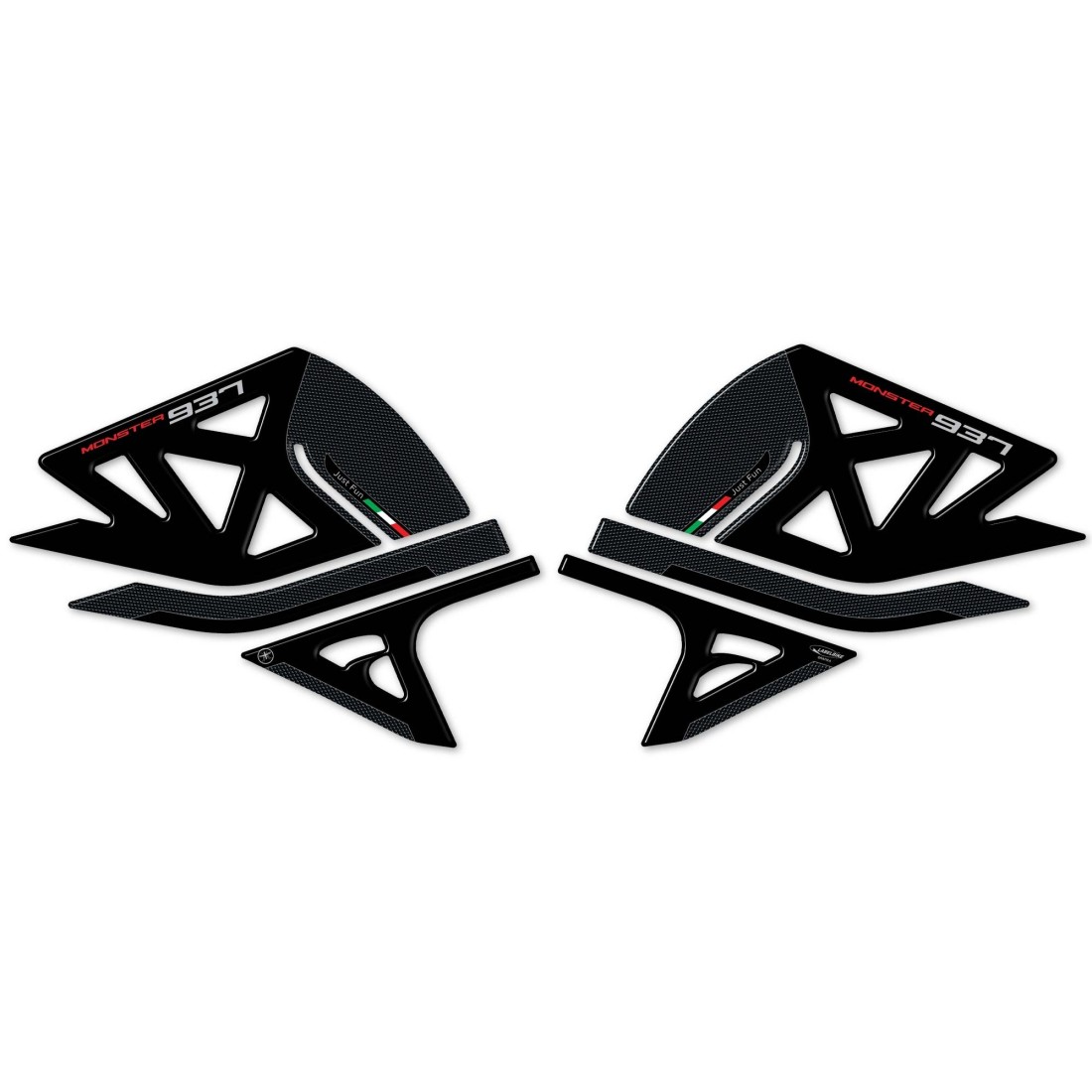 Aufkleber aus Harz für den Seitentankbereich des Motorrads Ducati Monster 937 2021. Zwei 3D-Harz-Gel-Aufkleber Exklusiv - Labelbike. Tank-Seitenaufkleber HERGESTELLT IN ITALIEN aus Harz mit 3D-Effekt. Schwarz und Carbon Look Basis Grafiken (Carbon-Effekt) und roten Schriftzug Monster.