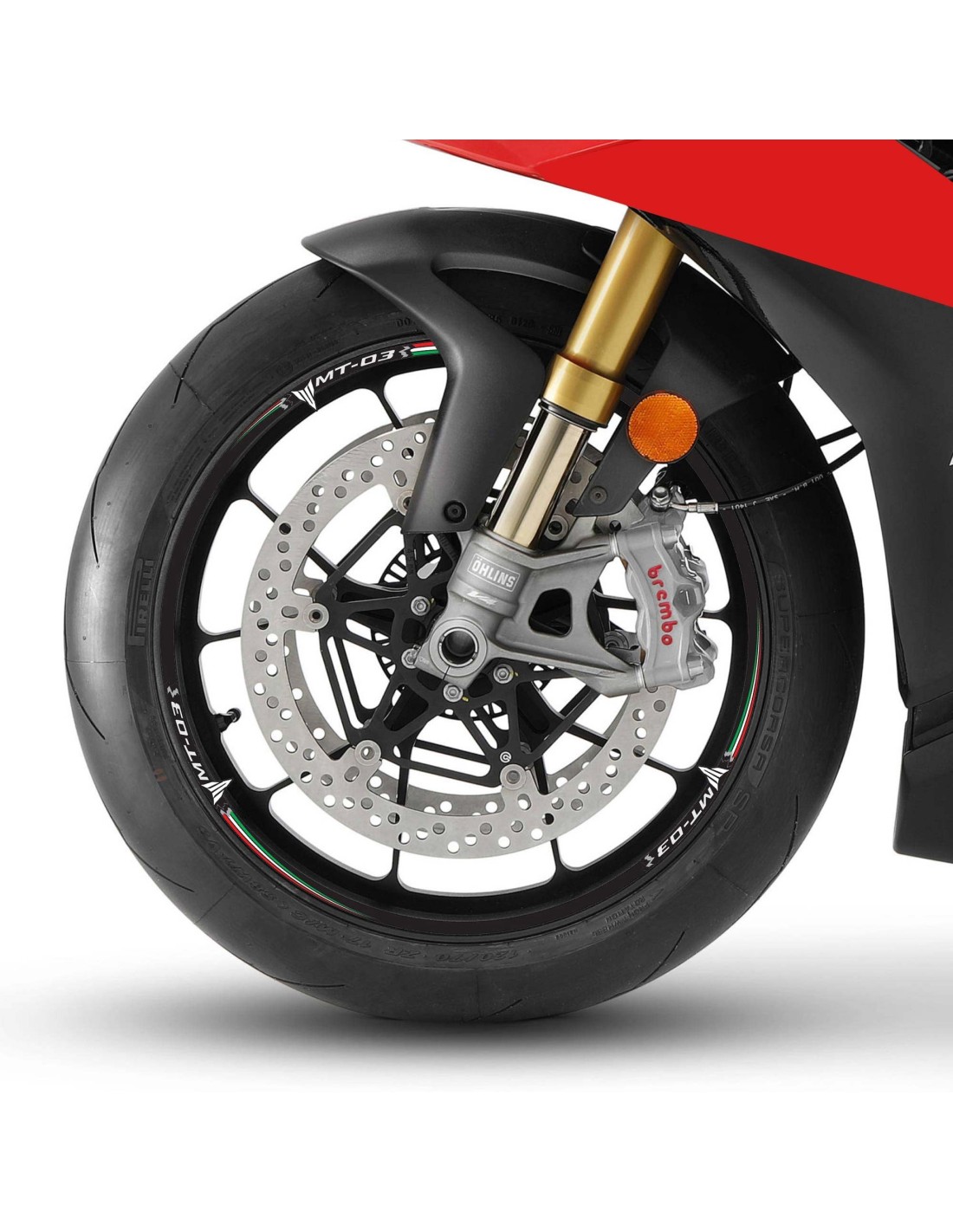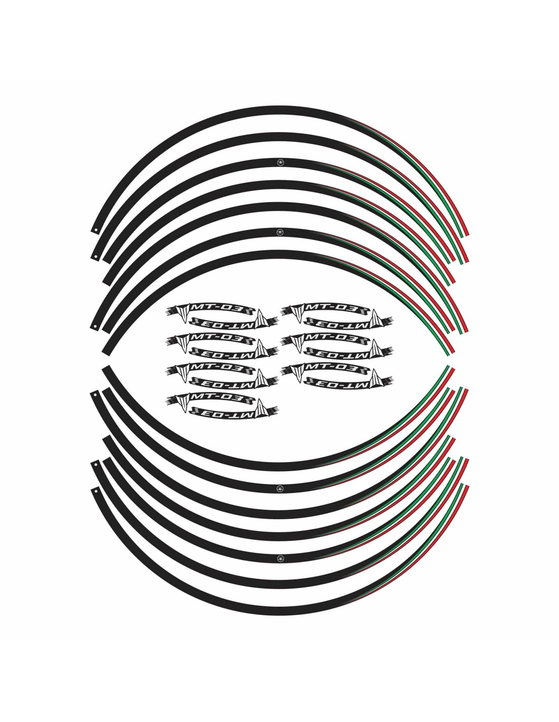 Aufkleber für beide Motorradfelgen, MADE IN ITALY. Basisgrafik in Weiß, Schwarz, Grün oder Rot mit Details der italienischen Trikolore und Schriftzug Mt-03.
