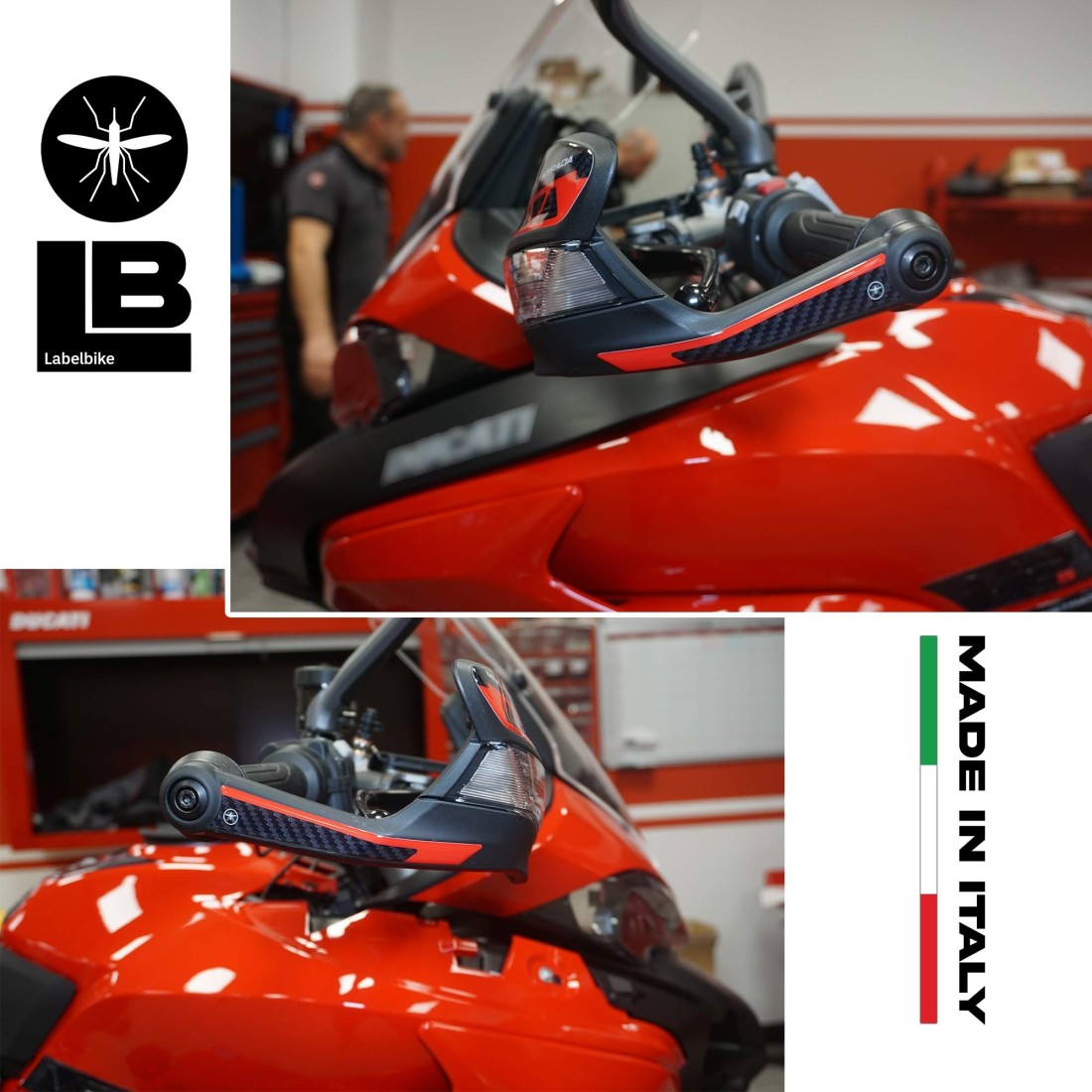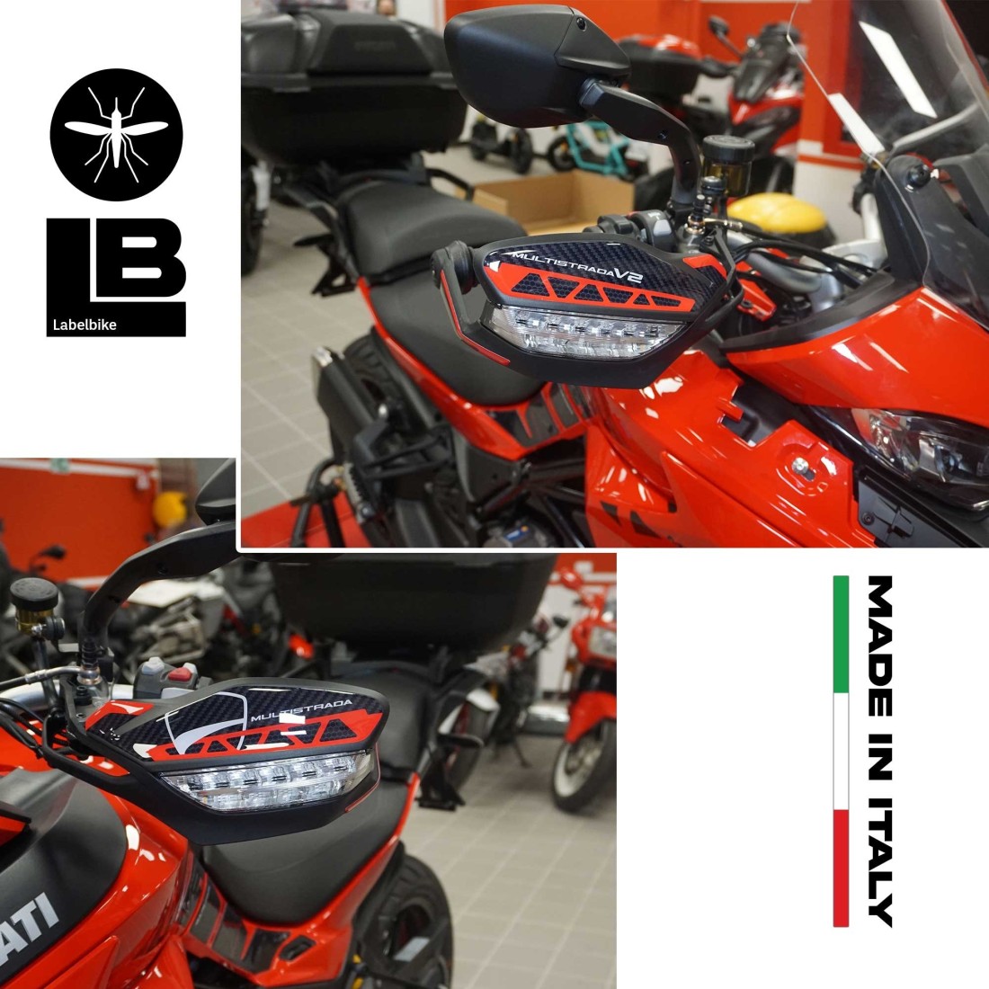 Handprotektoraufkleber aus Kunstharz für Ducati Multistrada V2 und V2s 950 ab 2021. 3D-Gel-Harz-Aufkleber Exklusiv - Labelbike®. Selbstklebende Handprotektoren IN ITALIEN GEFERTIGT aus Harz mit 3D-Effekt. Grafiken mit Schwarz, Rot und Carbon Look Basis (Carbon-Effekt) und Schrift Multistrada V2 Schriftzug.