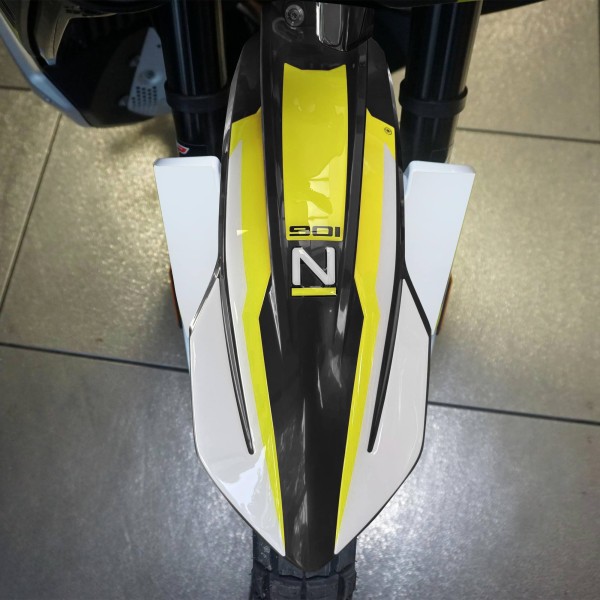 Made in Italy Aufkleber, Labelbike exklusiv, aus Harz mit weißem, gelbem und "901 N" Schriftzug. Unsere Aufkleber schmücken und machen einzigartig Ihre Husqvarna Norden 901 2022, schützen vor Stößen und Kratzern und widerstehen dem Wetter und UV-Strahlen.