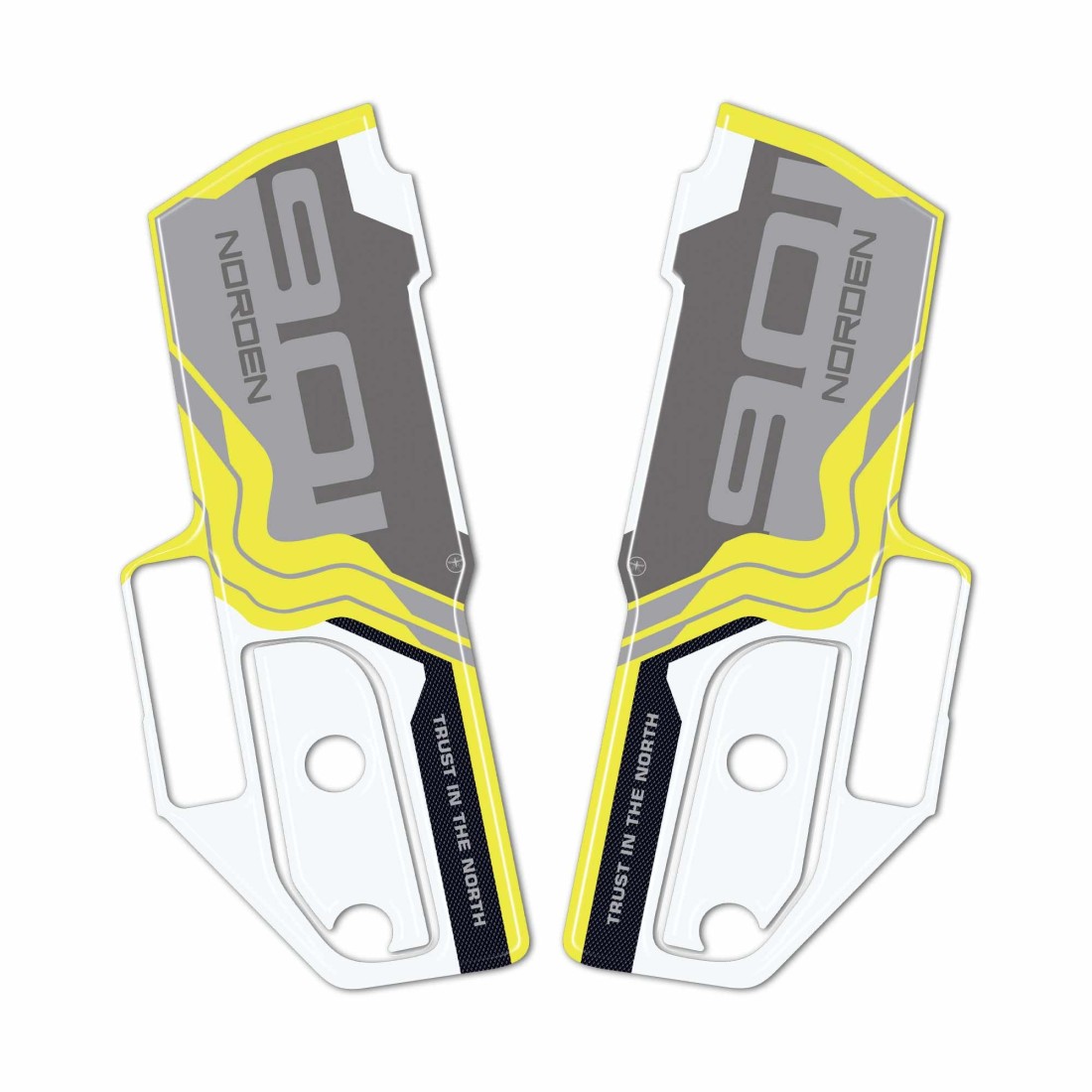 Harz-Klebe-Seitenschutz für Husqvarna Norden 901 2024 Motorrad-Kotflügelschutzbleche. Zwei 3D-Gel-Harz-Aufkleber Exklusiv - Labelbike. Selbstklebende Seitenschützer für den vorderen Kotflügel IN ITALIEN GEFERTIGT aus Harz mit 3D-Effekt. Grafiken in grau, gelb, weiß, schwarz mit der Aufschrift TRUST IN THE NORTH - NORDEN 901. Dekorieren und reparieren von Beulen und Kratzern die Flügelstreben Ihres Norden 901 2024 sind resistent gegen Waschen, Verwitterung und UV-Strahlen.