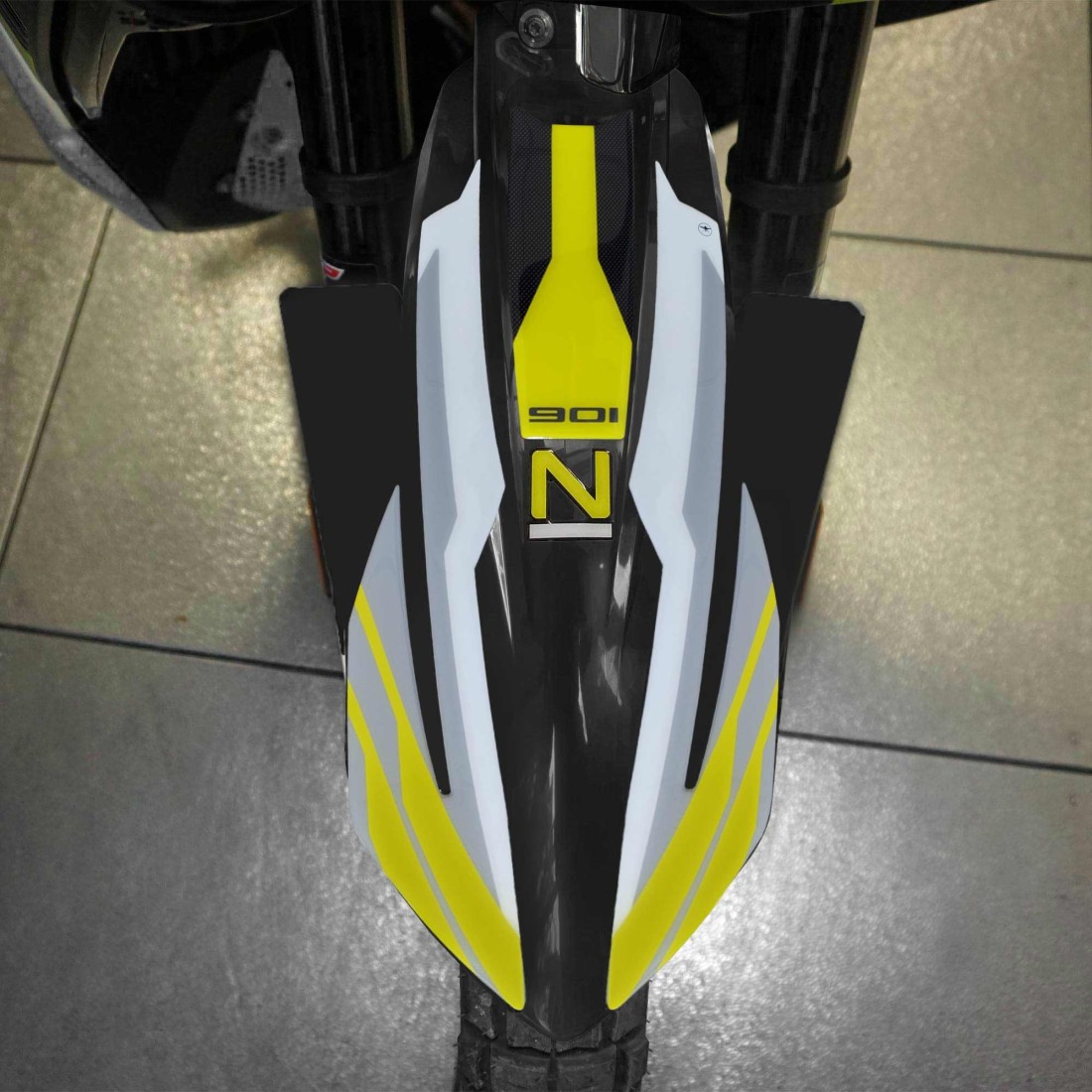 Aufkleber Made in Italy, exklusiv für Labelbike, aus Harz mit weißem, grauem und gelbem Schriftzug "901 N". Unsere Aufkleber schmücken und machen Ihre Husqvarna Norden 901 2024 einzigartig, schützen vor Stößen und Kratzern und widerstehen dem Wetter und UV-Strahlen.