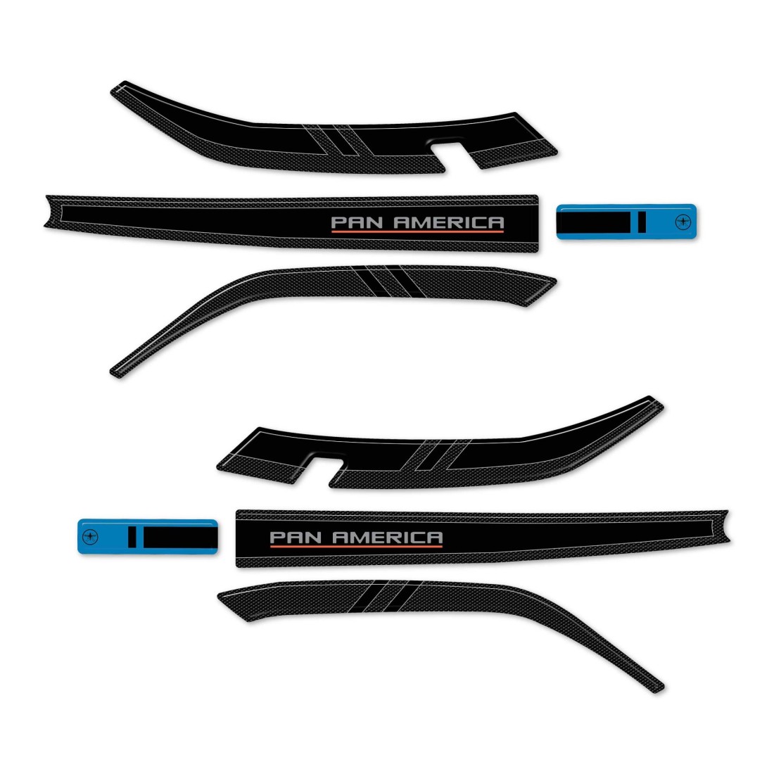 Harz 3D-Effekt Motorrad Handschutz Aufkleber. Paar für rechte und linke Seite aus selbstklebendem Kunstharz mit schwarzer Carbon Look (Karboneffekt) Grafik und Pan America Schriftzug.