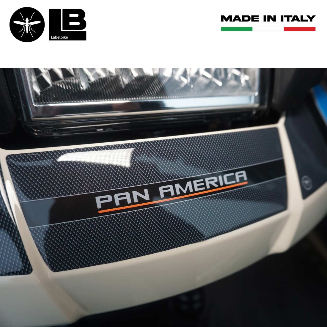 Motorrad-Frontaufkleber aus Harz mit 3D-Effekt. Aufkleber aus Kunstharz mit schwarzer und rutschfester Grafik, Pan America-Schriftzug und Details in Motorradfarbe.