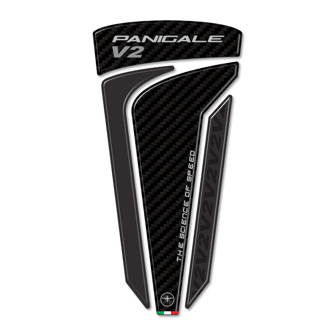 Motorrad-Tankschutz-Aufkleber HERGESTELLT IN ITALIEN aus Harz mit 3D-Effekt. Grafik im Carbon-Look (Karbon-Effekt) mit grauem Schriftzug V2 Panigale The Science of Speed.