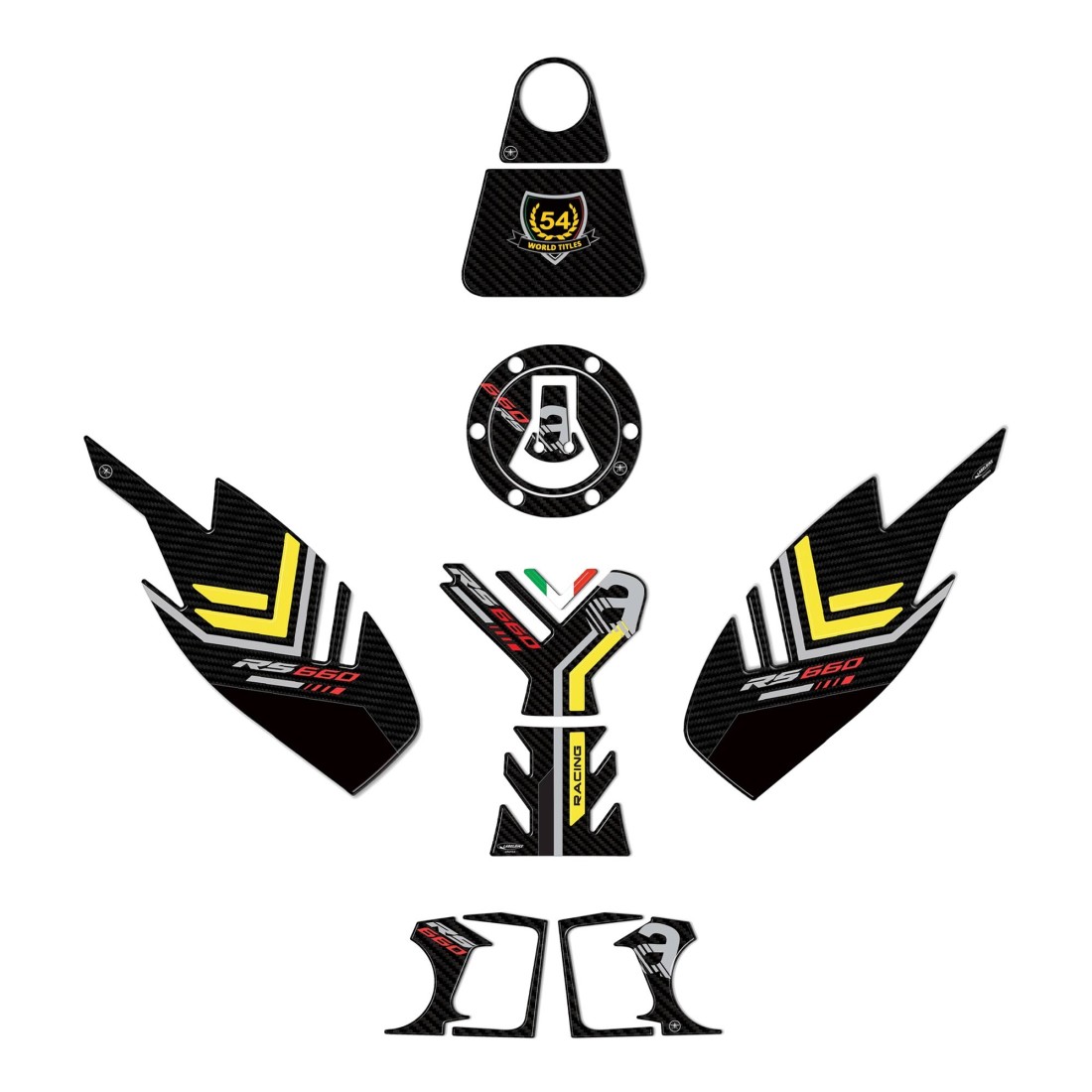 Harzaufkleber zum Schutz und zur Dekoration Ihrer Aprilia RS 660 2020-2023. Harzbeschichtete Motorrad-Grafiken 3D-Effektglänzende Oberfläche für gelbe Färbung. Kompletter Satz für gelbe Aprilia RS 660 Motorräder von 2020 bis 2025.