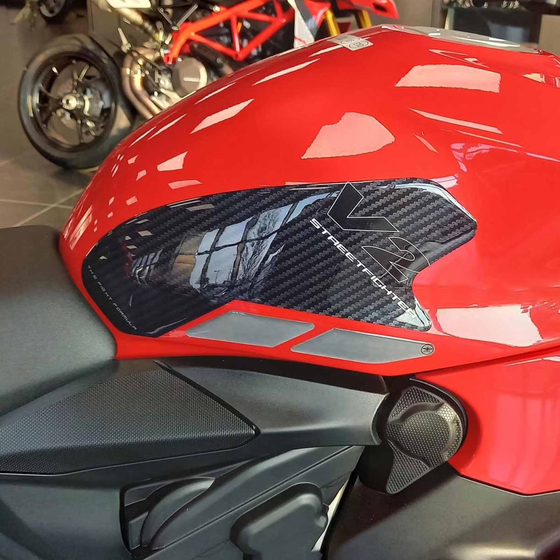 Tankschutzaufkleber aus Harz für Ducati Streetfighter Motorräder. Paar 3D-Harz-Gel-Aufkleber Exklusiv - Labelbike®. Tankschutzaufkleber für Motorräder, ideal für das Modell Ducati Streetfighter V2 (ab 2022).