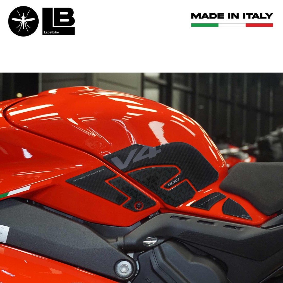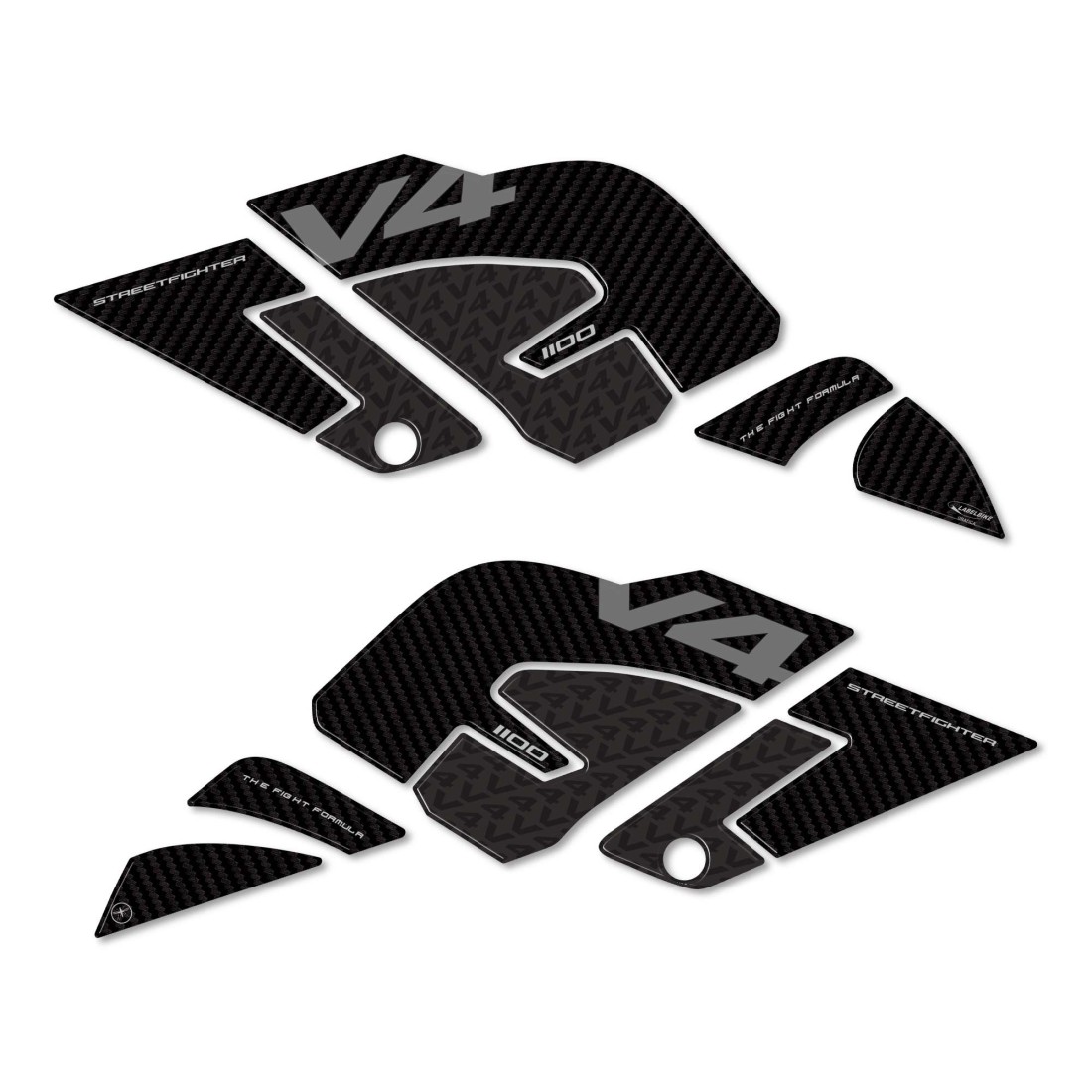 Motorrad-Aufkleber HERGESTELLT IN ITALIEN hergestellt aus Harz mit 3D-Effekt. Grafiken in Carbon Look (Karbon-Effekt) und V4 1100 Streetfighter und The Fight Formula Schriftzug.