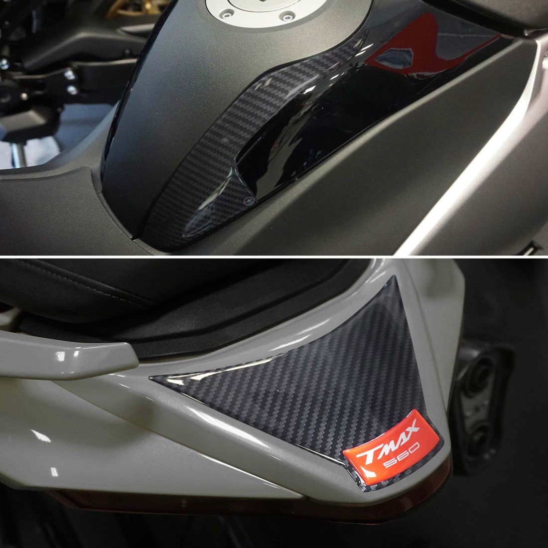 Resin Aufkleber schützen und dekorieren Ihre Tmax 2022-23. Grafiken mit Carbon-Effekt (Carbon-Look), ähnliche Anti-Rutsch und doppelte 3D-Details in Metallic Red Farbe.