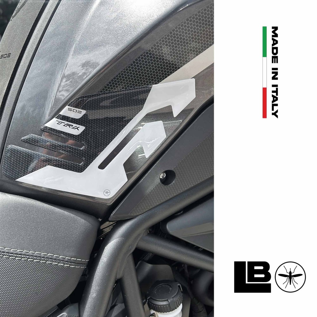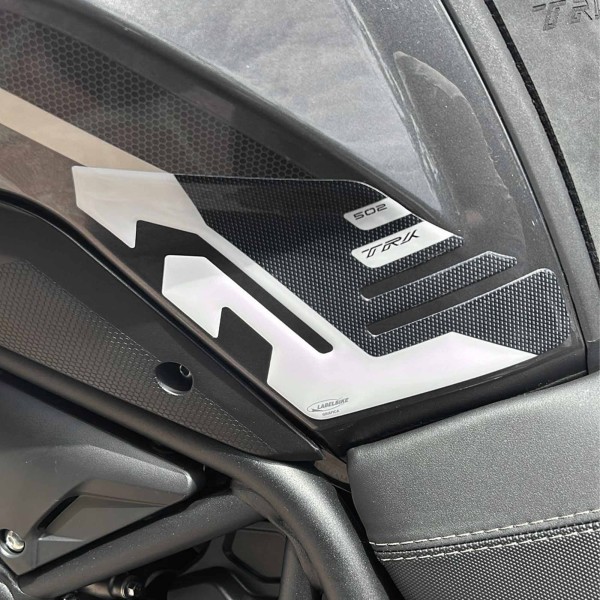 Seitenschutz für Benelli TRK 502 Motorradtank von 2021 bis 2025. Paar 3D-Gelharzaufkleber für die linke und rechte Tankseite, Exklusiv - Labelbike®. Aufkleber für weiße Motorradlackierung, schützen den Tank vor Kratzern. Harz-Klebeprotektoren IN ITALIEN GEFERTIGT.