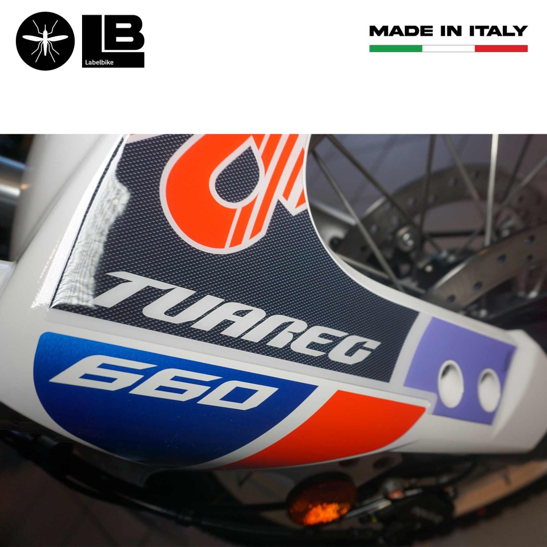 Harz Harz Seitenschutz für Motorrad Schutzbleche Aprilia Tuareg Indaco Tagelmust. Zwei 3D Gel Harz Aufkleber Exklusiv - Labelbike. Selbstklebende Seitenschützer für Vorderradkotflügel IN ITALIEN GEFERTIGT Hergestellt aus Harz mit 3D-Effekt. Dedizierte Farbgrafiken Indigo Tagelmust mit Tuareg-Schriftzug.