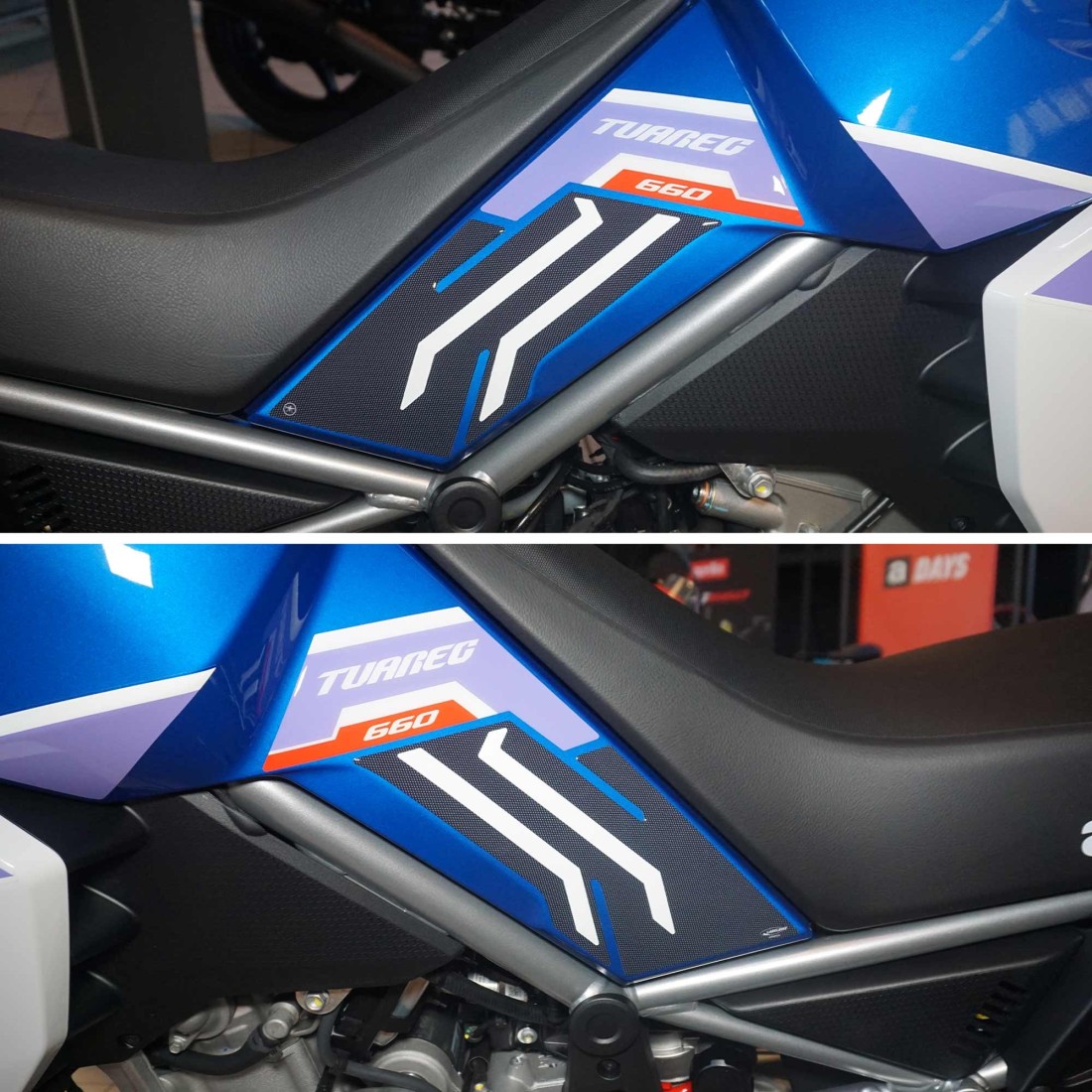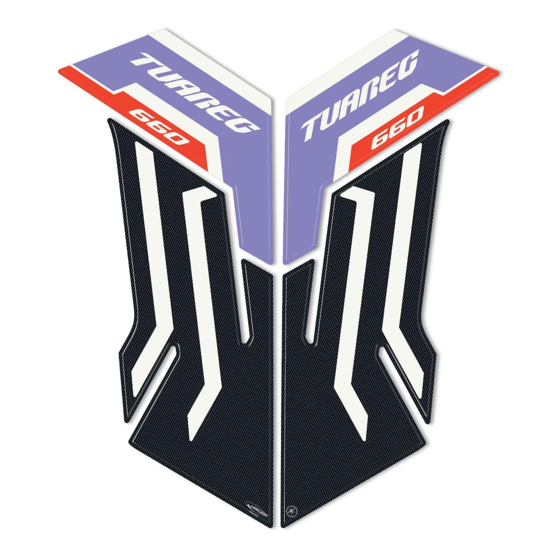 Harz-Klebeschutz für den Seitentankbereich des Motorrads Aprilia Tuareg 660 2022-23. Zwei 3D-Harz-Gel-Aufkleber Exklusiv - Labelbike®. Tank-Seitenaufkleber HERGESTELLT IN ITALIEN aus Harz mit 3D-Effekt. Grafiken, die der Indigo Tagelmust Färbung mit Schriftzug TUAREG 660.