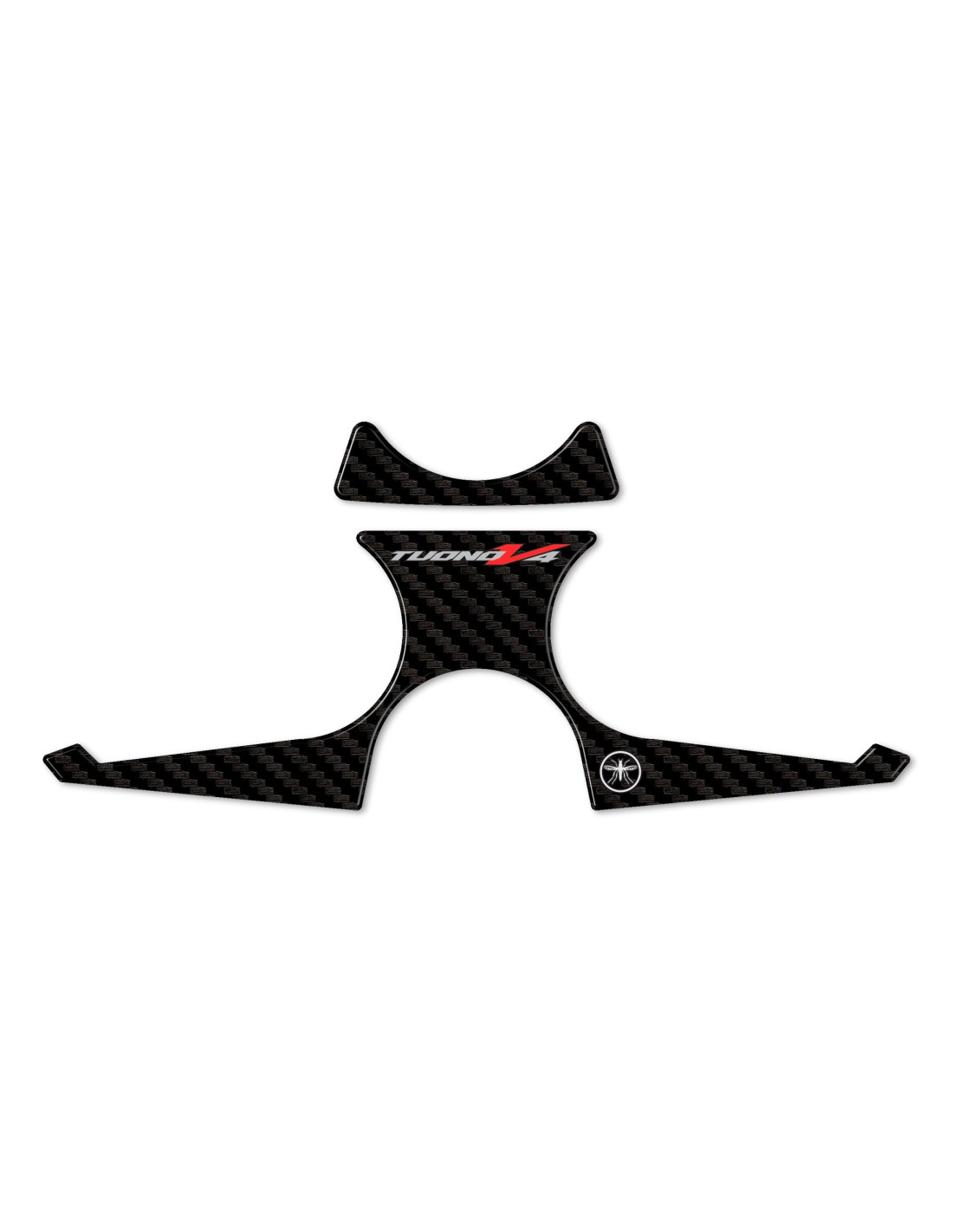 Klebeschutz aus 3D-Gelharz HERGESTELLT IN ITALIEN kompatibel mit der Tuono V4 Gabelplatte von 2021 bis 2025. Simil Carbon Grafik mit Schriftzug TuonoV4. Schützt die Lenkgabel Ihres Motorrads vor Stößen und Kratzern, widersteht Witterungseinflüssen und UV-Strahlen.