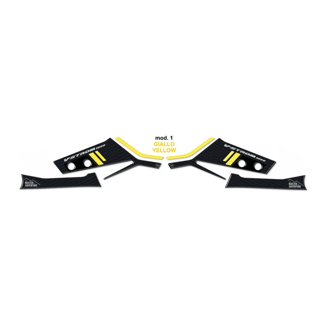 Klebstoffe Resin Handschutz für Motorräder Suzuki V-Strom 1050. Grafiken mit schwarzer Basis und Simil Antislip mit silbernem, orangem oder gelbem Finish.