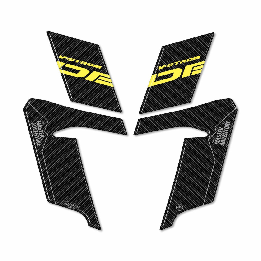 Harz-Klebeschutz für Motorrad-Kotflügel Seitenschutzbereich Suzuki V-Strom 1050 DE. Schutzaufkleber für den Seitenflügelbereich der V-Strom Version mit 21" Vorderrad. Exklusive 3D-Gelharz-Schutzaufkleber - Labelbike®. Harzaufkleber für den linken und rechten Seitenbereich des Motorradkotflügels IN ITALIEN GEFERTIGT Grafik in zwei Farben, gelb und grau, kompatibel mit allen Farben der 2023 V-STROM 1050DE: