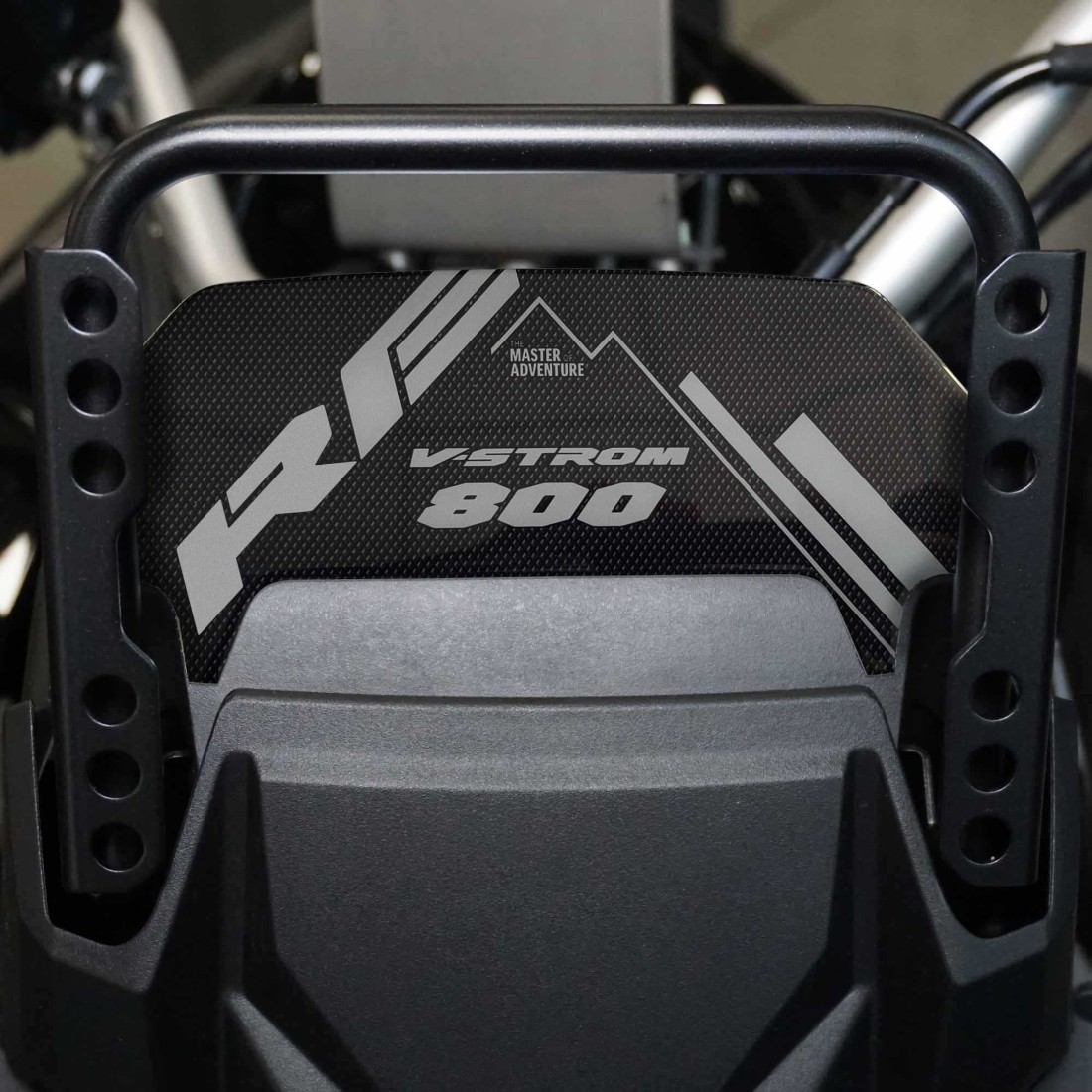 Aufkleber für die Windschutzscheibe des Motorrads im Bereich des Armaturenbretts aus Harz mit 3D-Effekt. Klebeschutz aus Harz mit Grafik in Grau und Schriftzug V-Strom 800RE.