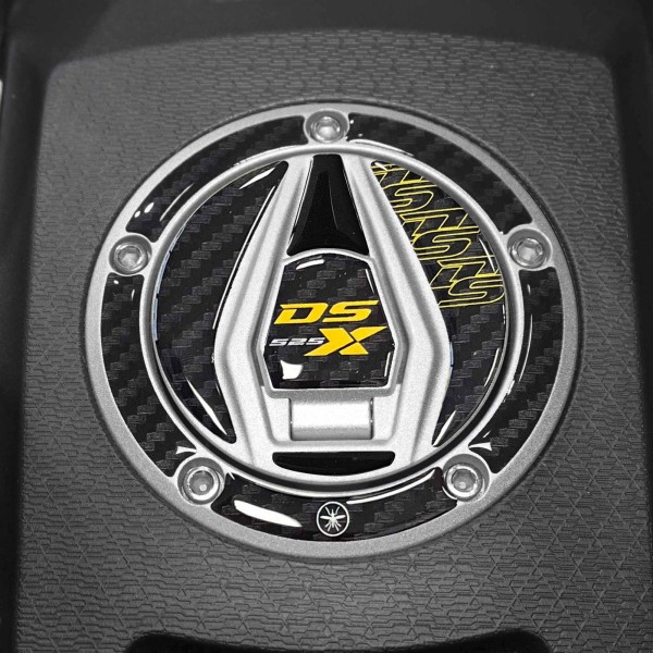 Motorrad-Tankdeckelschutzaufkleber aus Harz mit 3D-Effekt. Harzbeschichteter Schutzaufkleber mit Grafik in Blau oder Gelb oder Gold und Dsx 525 Schriftzug.