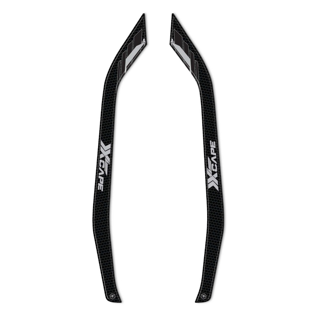 Aufkleber aus Harz für die Motorradgriffe der Moto Morini X-CAPE 2022 - 2024. Zwei Aufkleber für den hinteren Bereich des Motorrads, rechte und linke Seite, aus 3D-Gelharz Exklusiv - Labelbike®. Motorrad-Griffschutz-Aufkleber HERGESTELLT IN ITALIEN aus Harz mit 3D-Effekt. Universelle Grafik, 3D-Aufkleber mit rutschfestem Untergrund und schwarzem X-CAPE-Schriftzug.