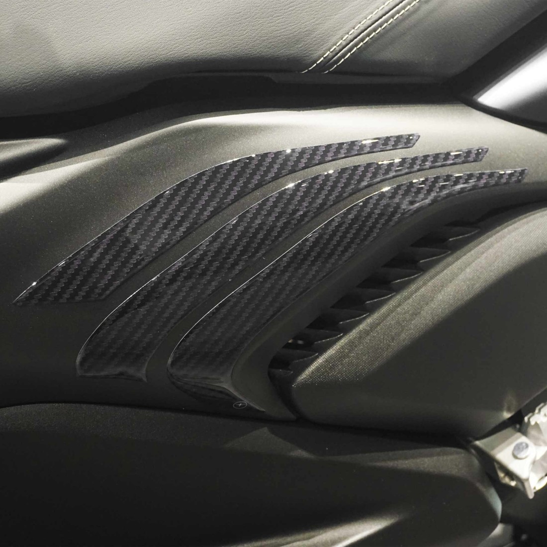 Selbstklebender Schutz für die Fußrasten der Xmax-Roller 2023-24 Version 125 und 300. Grafiken mit Karboneffekt ideal für alle Xmax-Farbvarianten ab 2023. Aufkleber mit 3D-Effekt aus Harz, Exklusive Labelbike MADE IN ITALY.