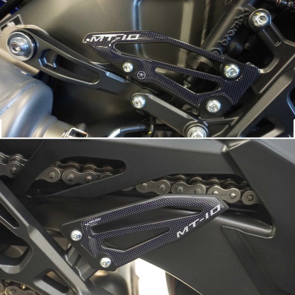 Adhesivos protectores de talón de resina con efecto 3D. Par para lado izquierdo y derecho de protectores adhesivos de resina con gráficos Carbon Look (efecto carbono) y letras MT-10.