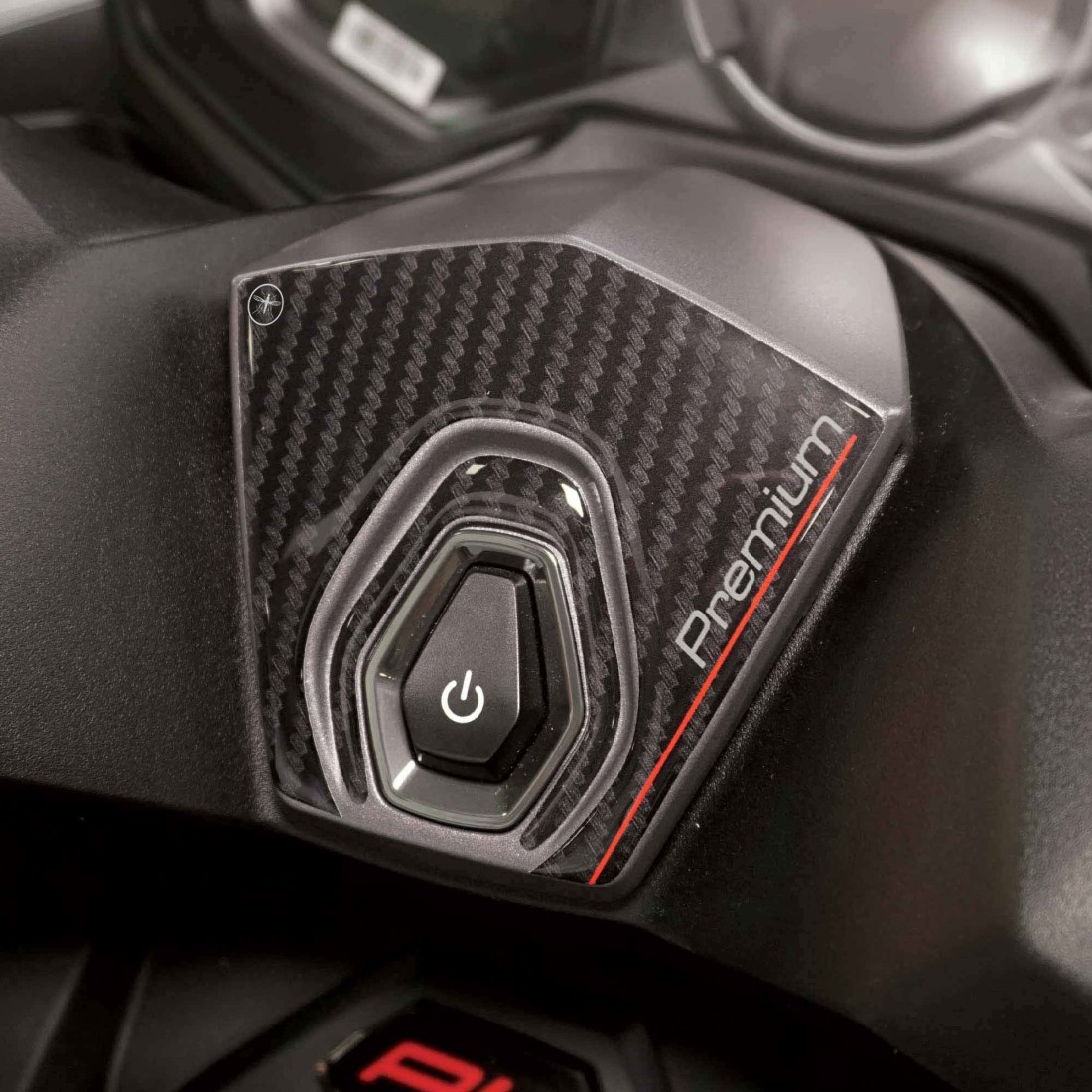 Protectores adhesivos para la zona alrededor del botón de encendido Kymco Ak550 Premium a partir de 2023. Gráficos con base efecto carbono y letras Premium. Pegatinas de resina efecto 3D, Exclusivo Labelbike MADE IN ITALY.