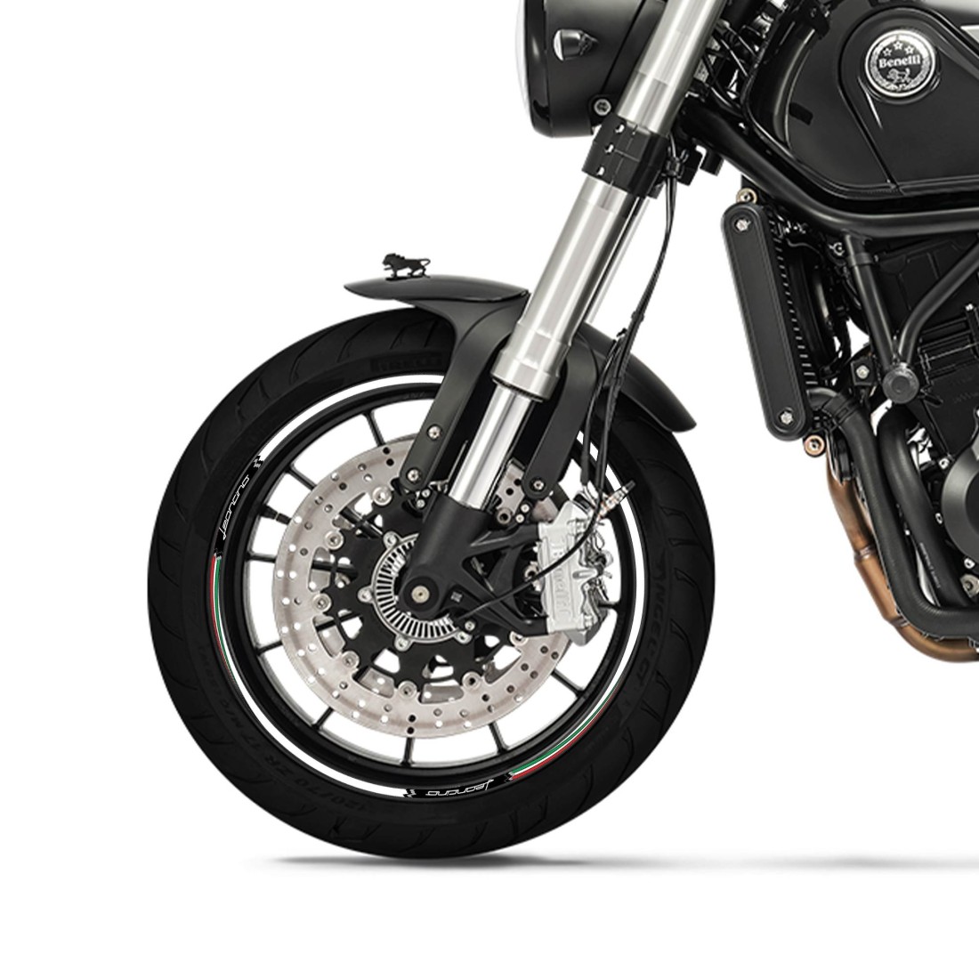 Adhesivos para ambas ruedas de moto, MADE IN ITALY. Gráficos base en Blanco, Negro o Rojo con detalles de la bandera tricolor italiana y letras Leoncino. Decoran y realzan la estética de tu Leoncino Benelli, resistentes a los lavados, a la intemperie y a los rayos UV.