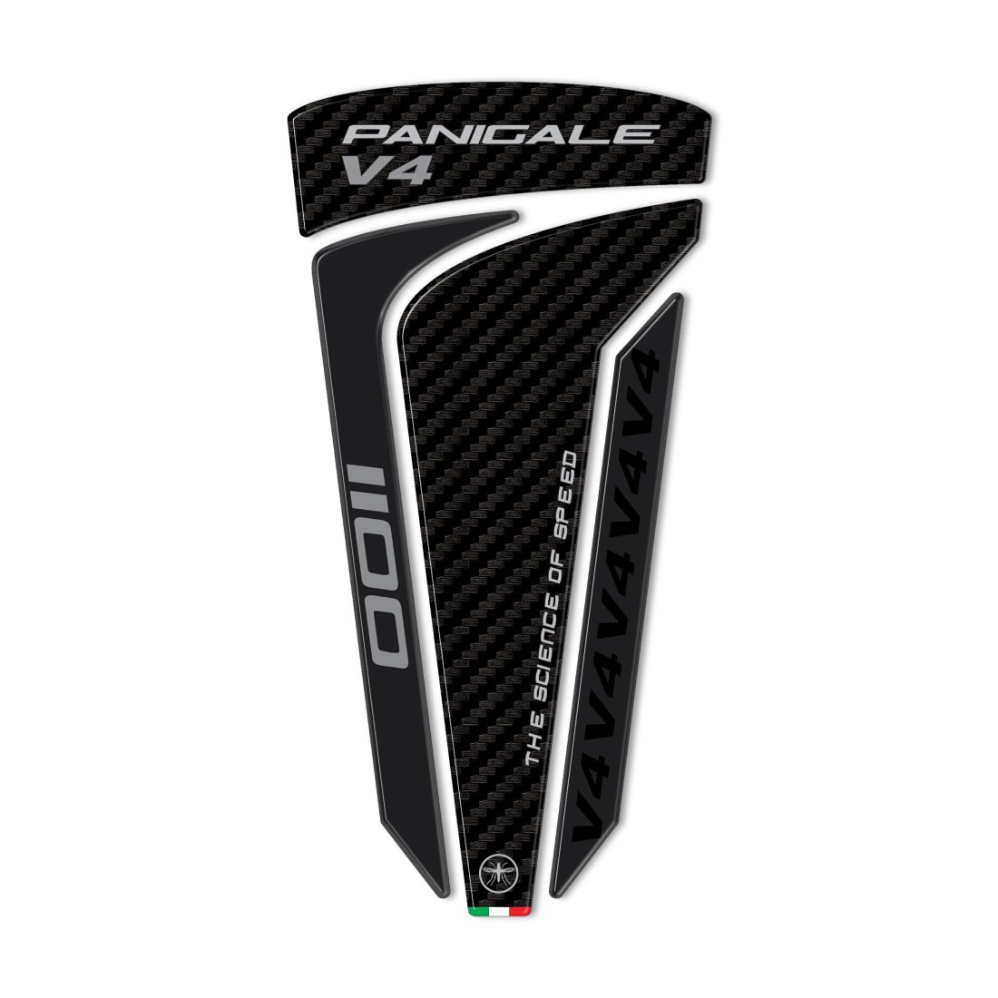Adhesivo protector depósito moto HECHO EN ITALIA Realizado en resina con efecto 3D. Gráficos en Carbon Look (efecto carbono) con letras grises V4 1100 Panigale y The Science of Speed.