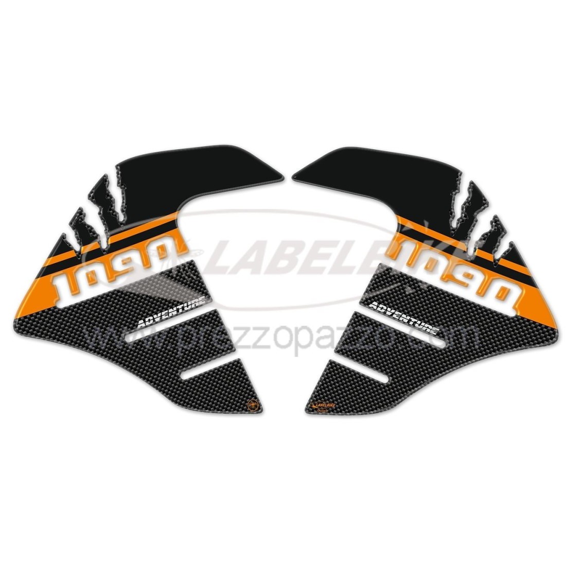 - Los adhesivos para depósito que vas a comprar son de color negro, en imitación carbono con la palabra ADVENTURE en gris y la 1090 en bajorrelieve. Protegen el depósito de tu moto de golpes y arañazos causados por el roce de las piernas en los laterales del depósito.