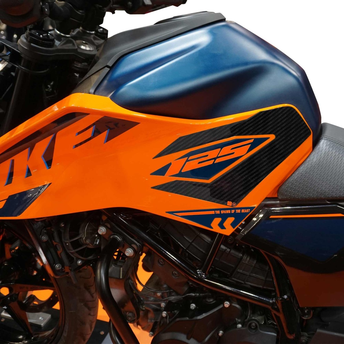 Pegatinas laterales de depósito de moto fabricadas en resina con efecto 3D. Pareja para lado derecho e izquierdo de protectores adhesivos recubiertos de resina con gráficos en naranja y azul sobre una base con efecto carbono y letras 125 el engendro de la bestia.