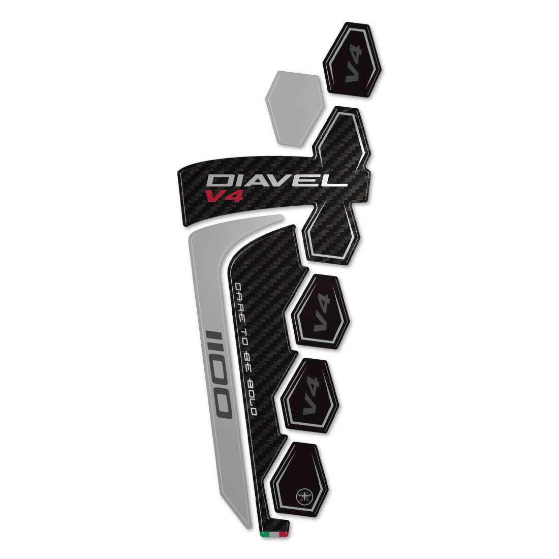 Nuestros adhesivos dan personalidad y realzan el aspecto de tu moto. Personaliza tu Diavel y hazla única con nuestros adhesivos de resina para moto. Protegen de golpes y arañazos y son resistentes a la intemperie, a los lavados y a los rayos UV.