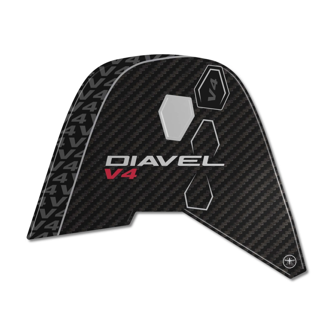 Adhesivo para moto HECHO EN ITALIA realizado en resina con efecto 3D. Gráficos en Carbon Look (efecto carbono) con inscripción Diavel V4 . Pegatinas de resina ideales para proteger y decorar; compatibles con los colores Rojo Ducati y Negro Thrilling. Gráficos de moto revestidos de resina con efecto 3D, superficie brillante.
