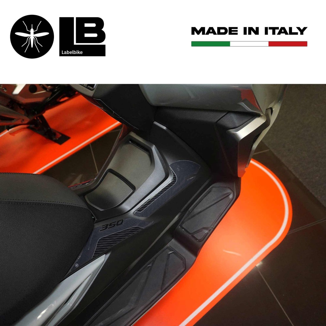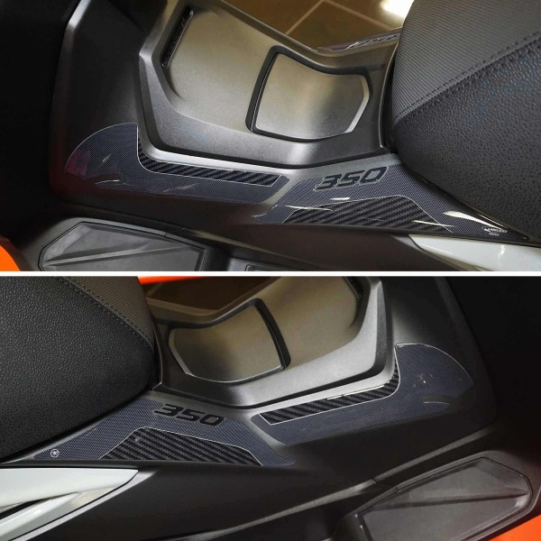 Protectores adhesivos recubiertos de resina para zona central del estribo y Túnel Central. Gráficos con Simil Antideslizante y base de Fibra de Carbono y letras 350. Adhesivos con efecto 3D recubiertos de resina, Exclusivo Labelbike® MADE IN ITALY.
