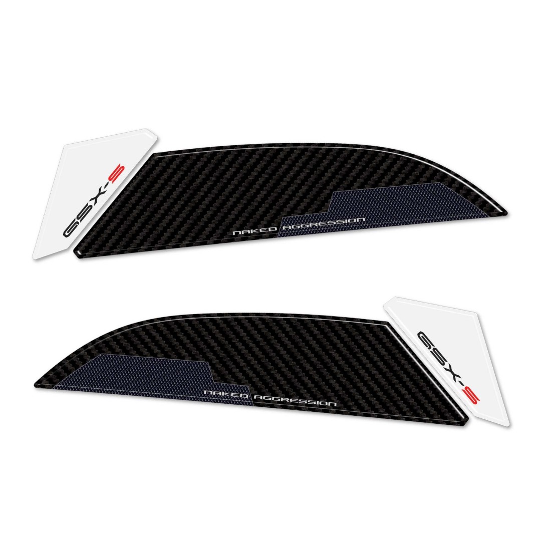 Protectores adhesivos de resina para la zona lateral del depósito de la moto Suzuki GSX-S 1000 2024. Dos adhesivos 3D de resina de gel Exclusivo - Labelbike®. Adhesivos laterales depósito HECHO EN ITALIA realizados en resina con efecto 3D. Gráficos para color 2024 Carbon Look y blanco o Carbon Look y rojo con letras GSX-S Naked Aggression.