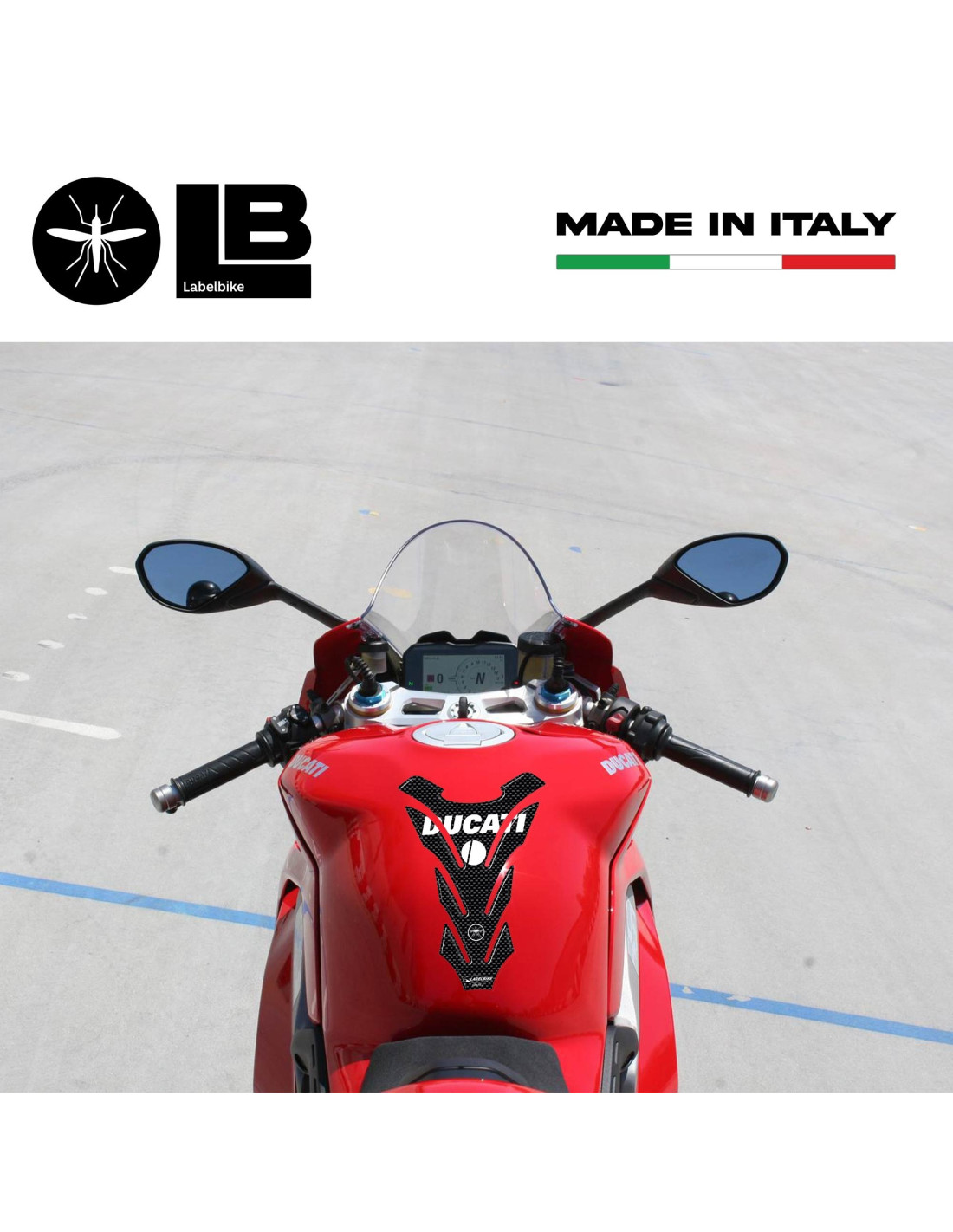 PANTALLA DE RESINA 3D PARA PROTECCION DE DEPÓSITO DE MOTO "DUCATI" Tamaño: 14 x 20 cm la pegatina de depósito que va a comprar está hecha de material similar al carbono con letras blancas como en la foto.
