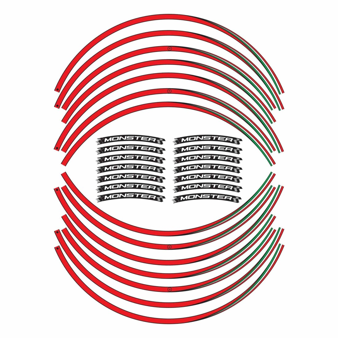Adhesivos para perfil de rueda de moto Ducati Monster y Monster versión 937 2021.Exclusivo kit de bandas adhesivas - Labelbike®. Adhesivos para rueda de moto MADE IN ITALY. Gráficos en rojo con bandera italiana y letras Monster. Decoran y realzan el aspecto de tu Ducati Monster, resisten al lavado, a la intemperie y a los rayos UV.