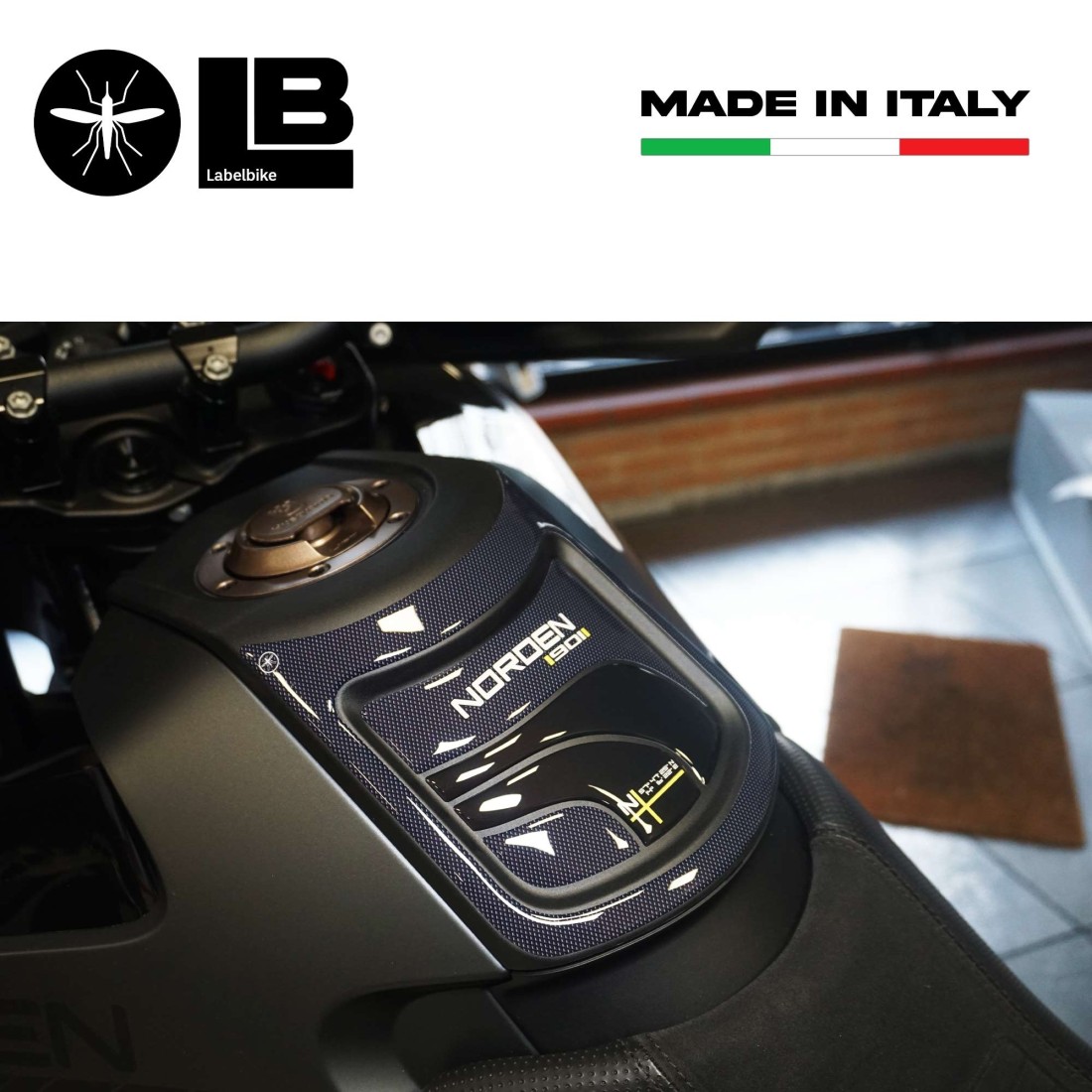 Protector de depósito Made in Italy, exclusivo de Labelbike, hecho de resina conCarbon Look y letras Norden.