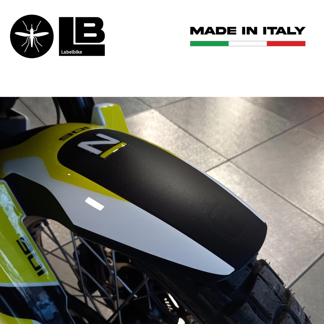 Adhesivos Made in Italy, exclusivos Labelbike, de resina con colores amarillo, negro y blanco y letras 901. Nuestros adhesivos decoran tu Norden 901 y la hacen única, la protegen de golpes y arañazos y son resistentes a la intemperie y a los rayos UV.